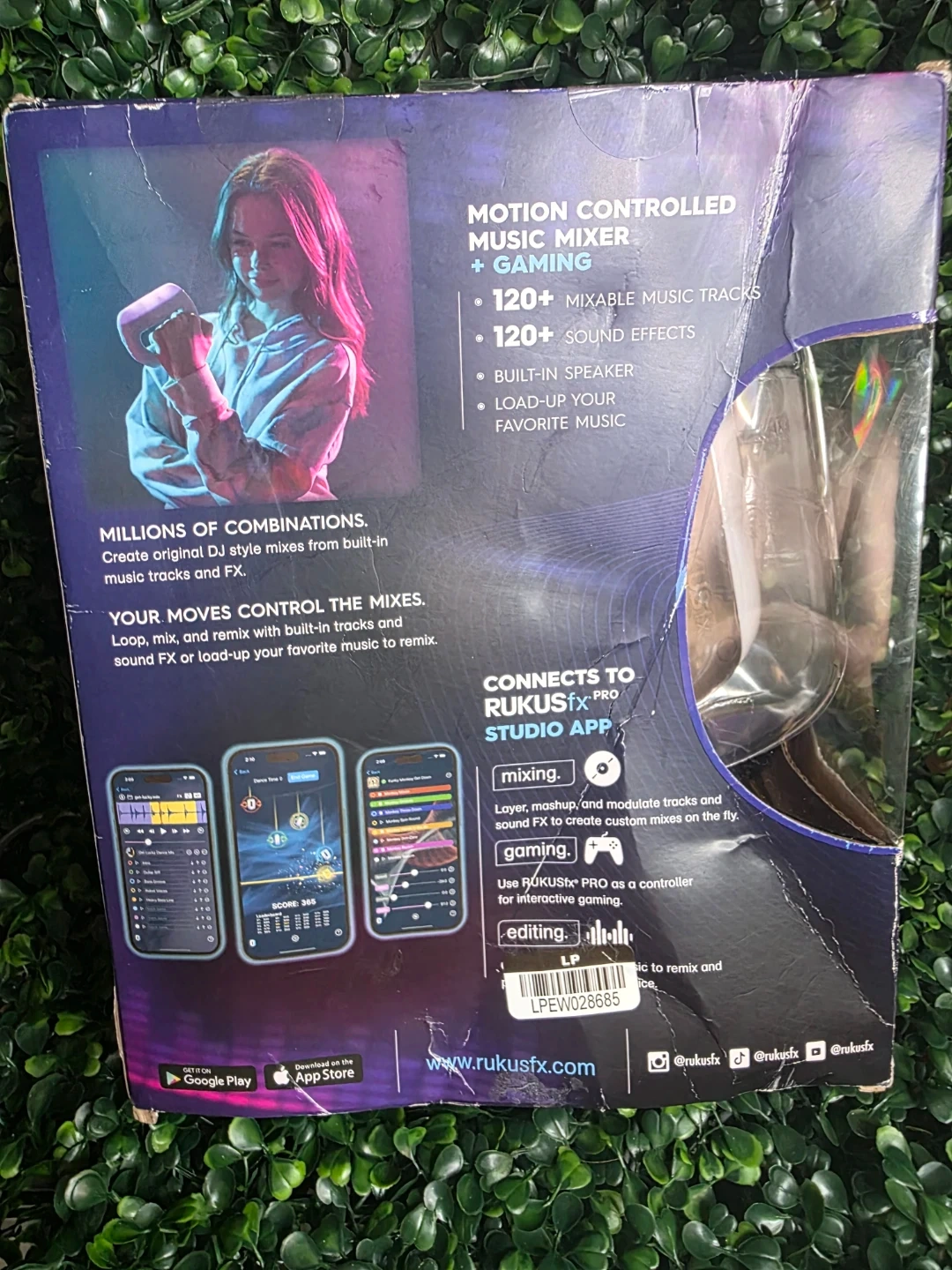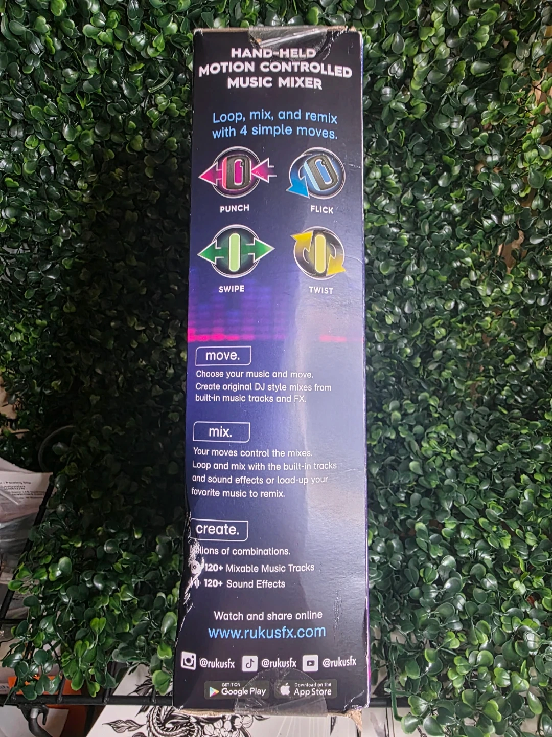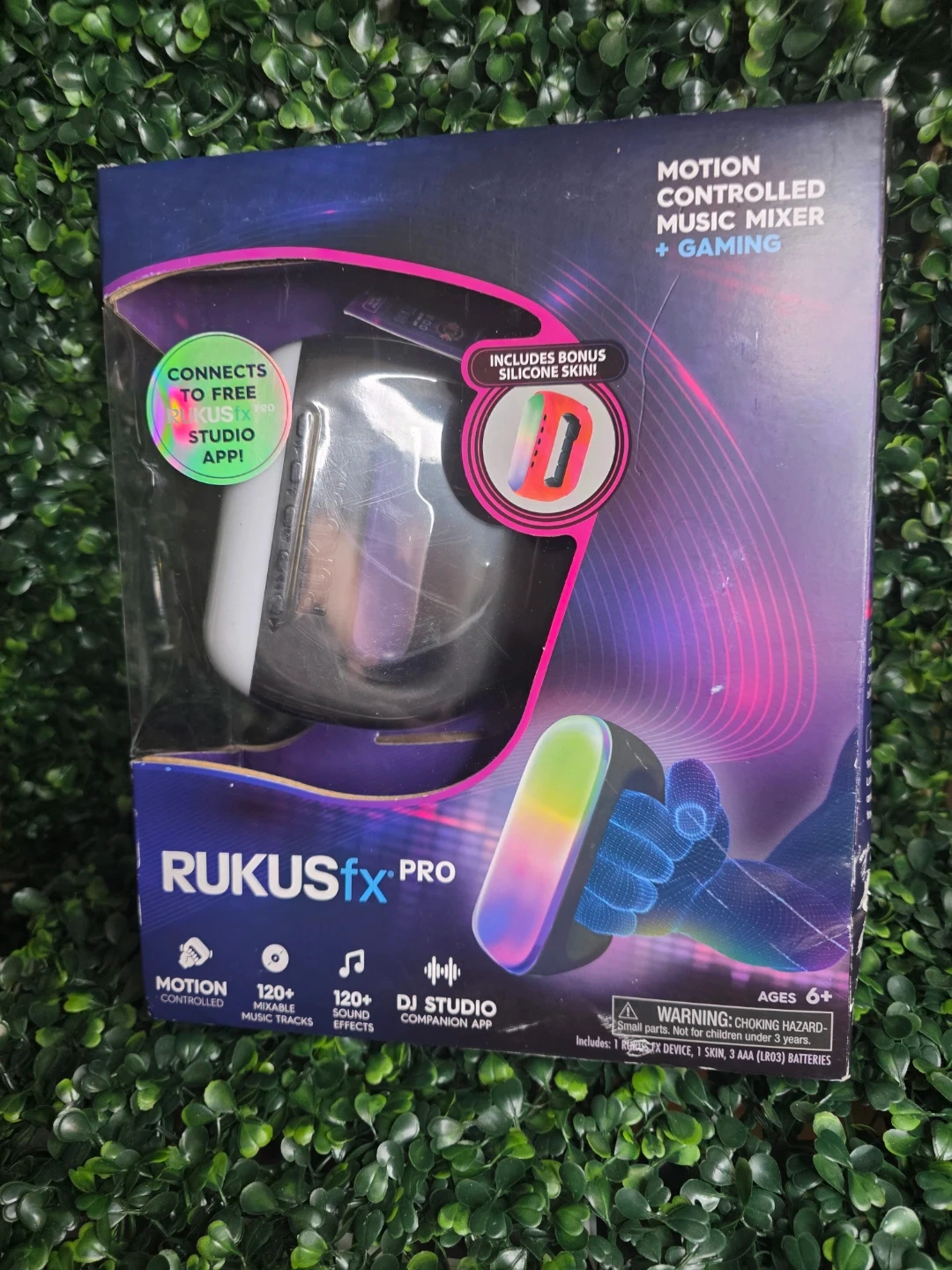 This Rukusfx Pro is a motion-controlled music mixer and gaming device. It connects to the Rukusfx Pro Studio app and includes over 120 mixable music tracks and sound effects. It also features a built-in speaker and allows you to load up your favorite music.