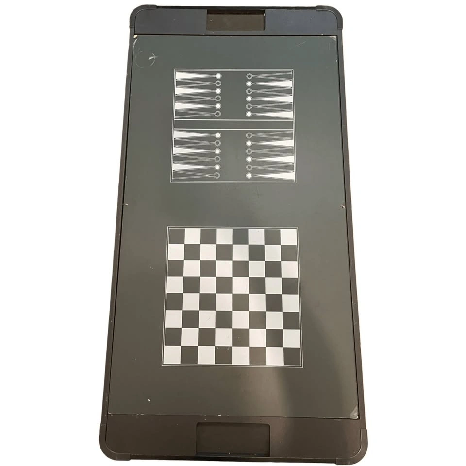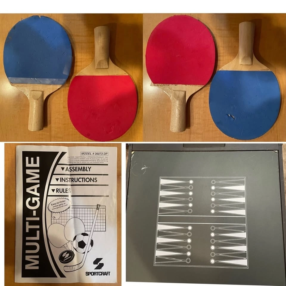Condition: Missing the net for foosball, 1 white pawn and 1 black bishop for chess. The paddles show age-related wear but are in good condition overall. There are some minor, hardly noticeable cosmetic surface nicks in the wood. The air hockey fan works. Game boards may show natural signs of aging, including some white markings. The ends of the air hockey table where the foosball table sits have some documented nicks.