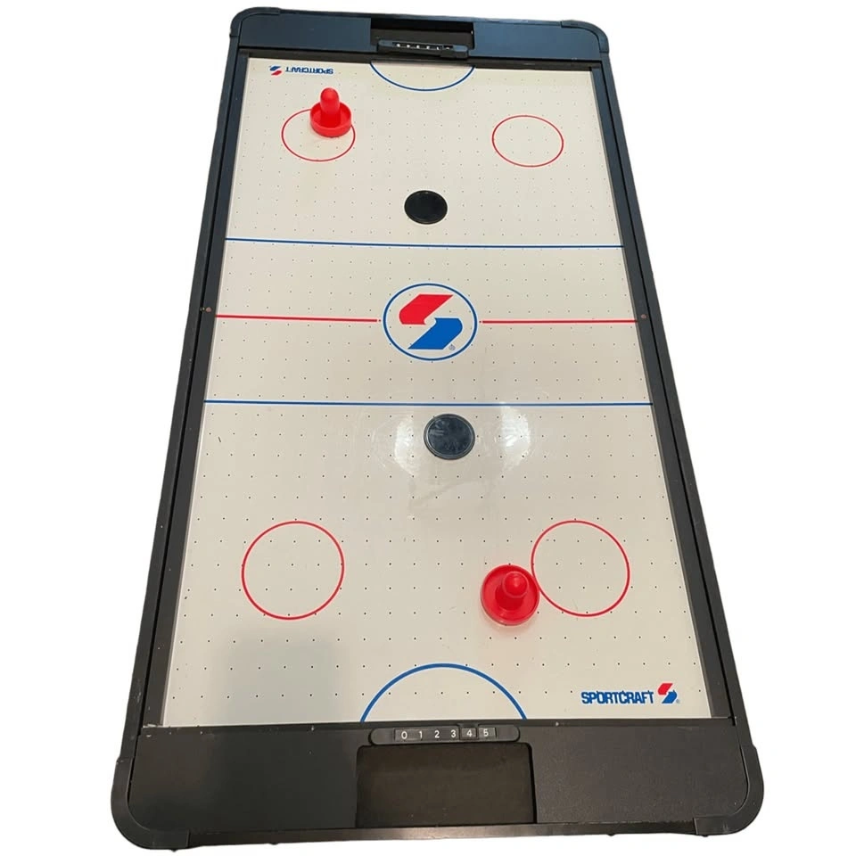 This stacking design Sportcraft multi-game table includes foosball table on top (comes with 4 balls-two white & 2 orange) and air hockey below (includes 2 red pushers, 2 black pucks, & 2 black score keepers).