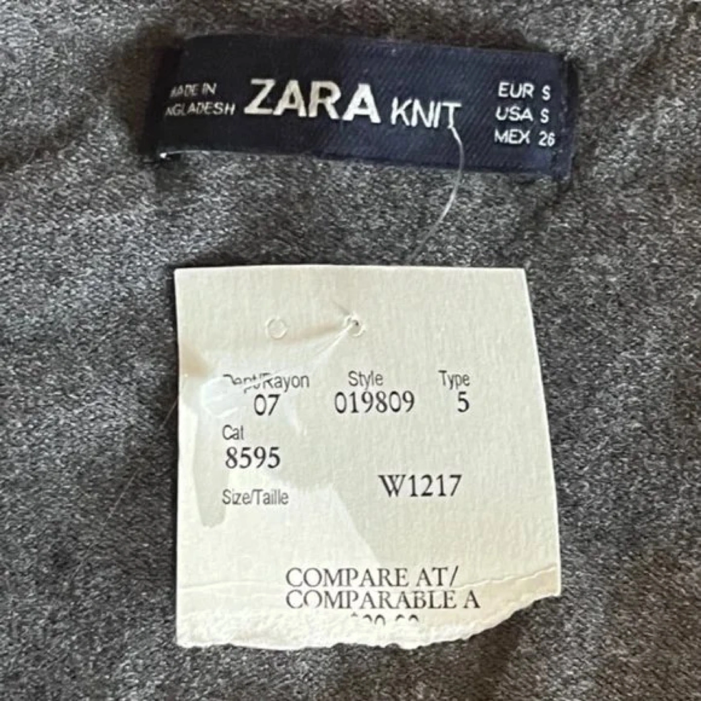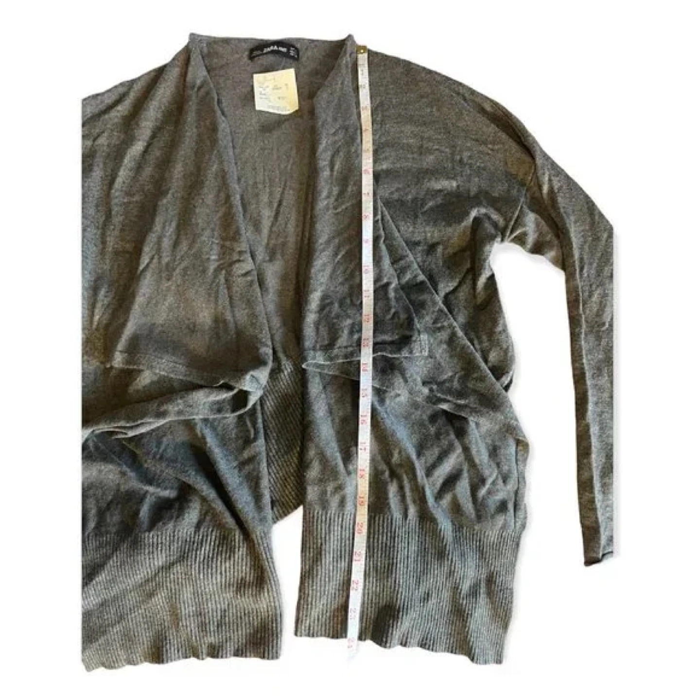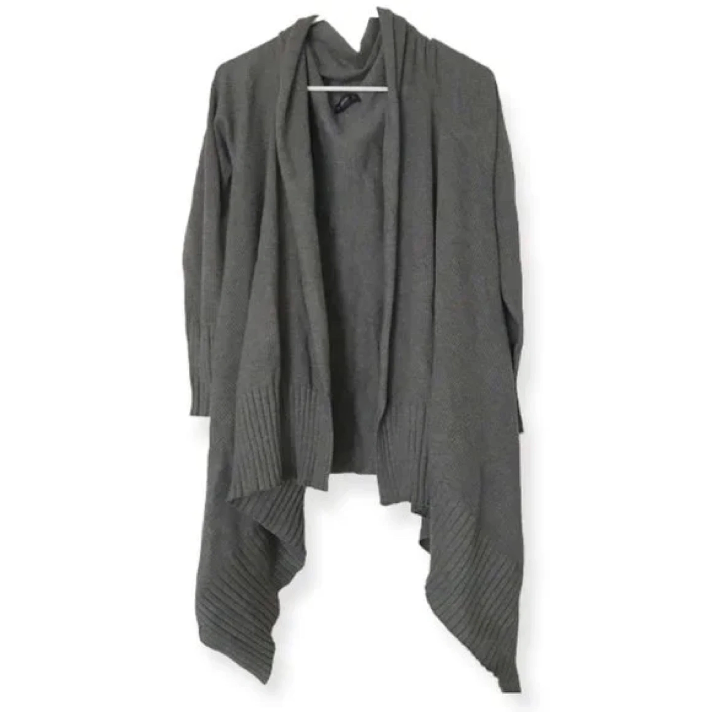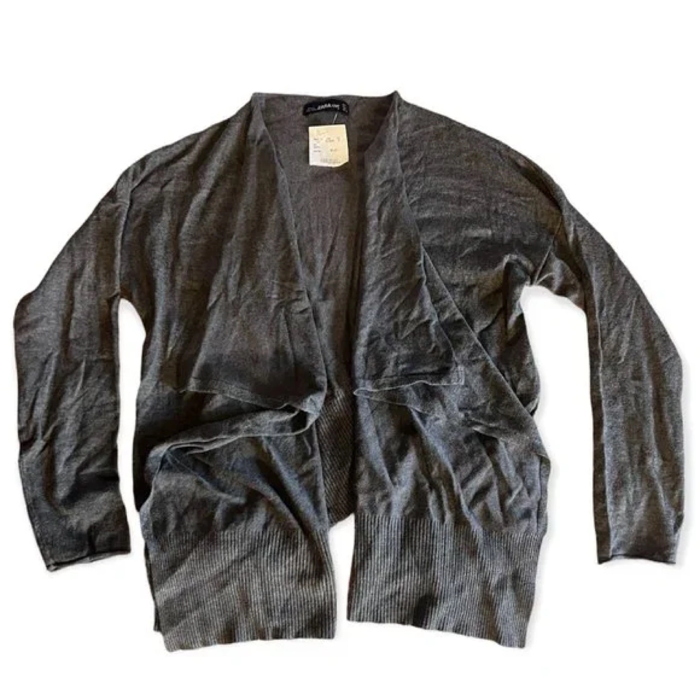 Grey knit cardigan. Asymmetrical hemline. Long sleeves. Open front. Soft material. Size S.