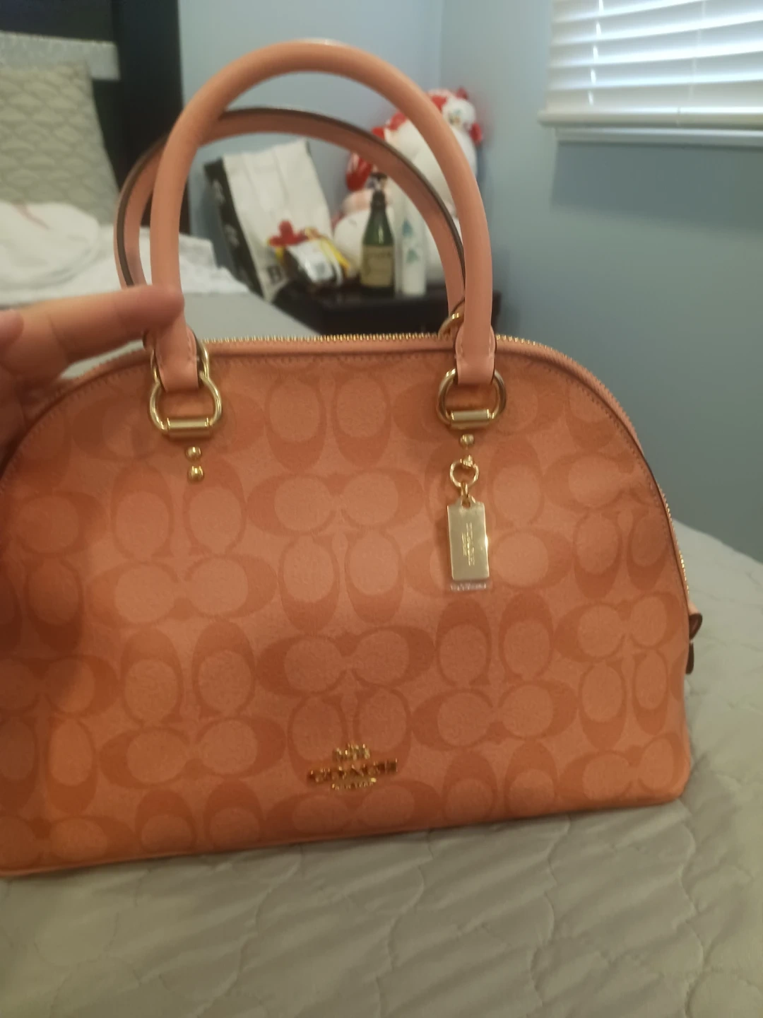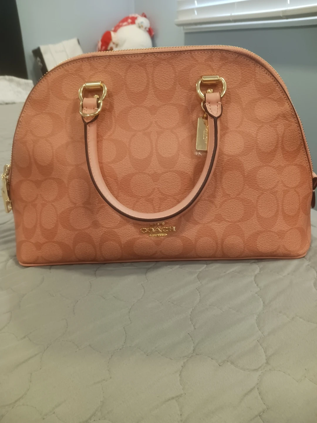 This Coach dome satchel handbag comes in a lovely pink color with the signature "C" monogram pattern. It features dual top handles and a zip-top closure. Includes an adjustable shoulder strap for versatile wear. Interior has a zip pocket and slip pockets.
