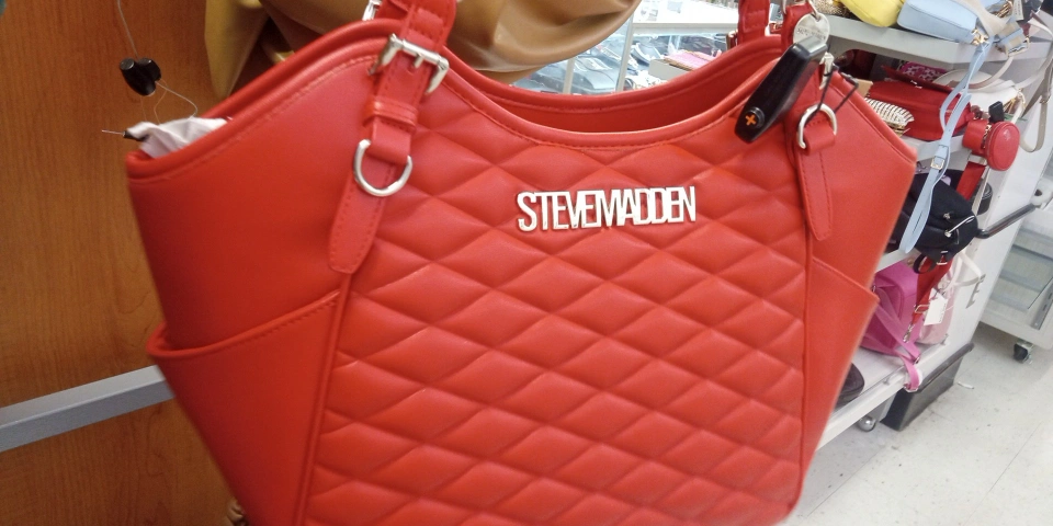 Red quilted tote bag. Features silver hardware and a Steve Madden logo. Two separate images showing slightly different angles.