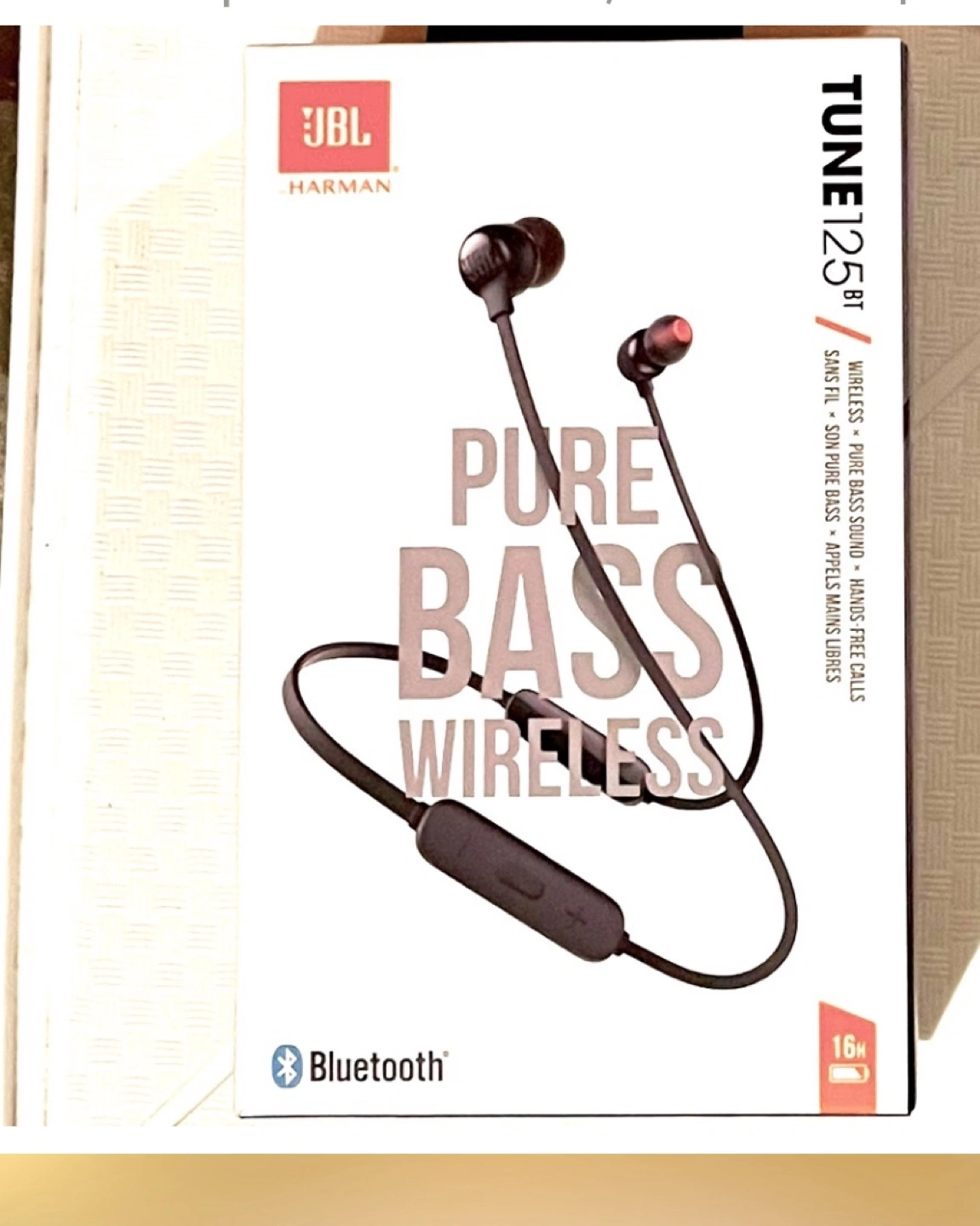 JBL Tune 125BT wireless earbuds. Pure Bass sound. Hands-free calls. Bluetooth 5.0. 16 hours of playtime. Includes USB-C charging cable. Magnet cable management.