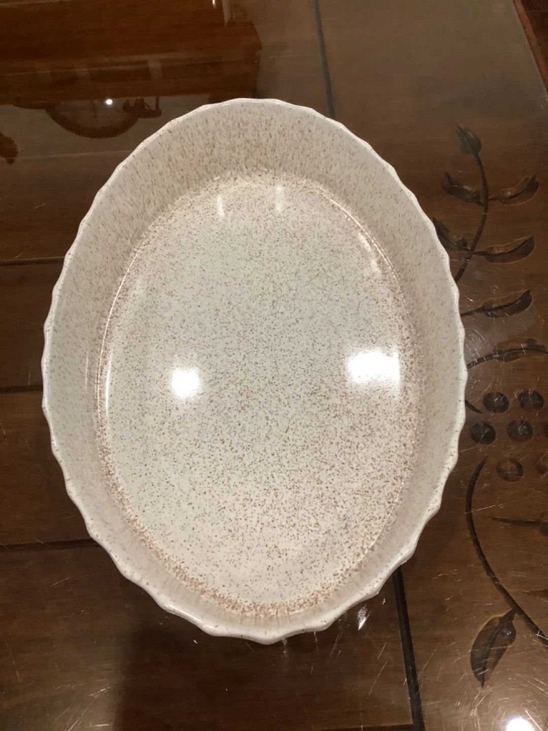 Large oval baking dish. Speckled off-white glaze. Measures approximately 14" x 9.5" x 2.5" deep. Excellent condition.