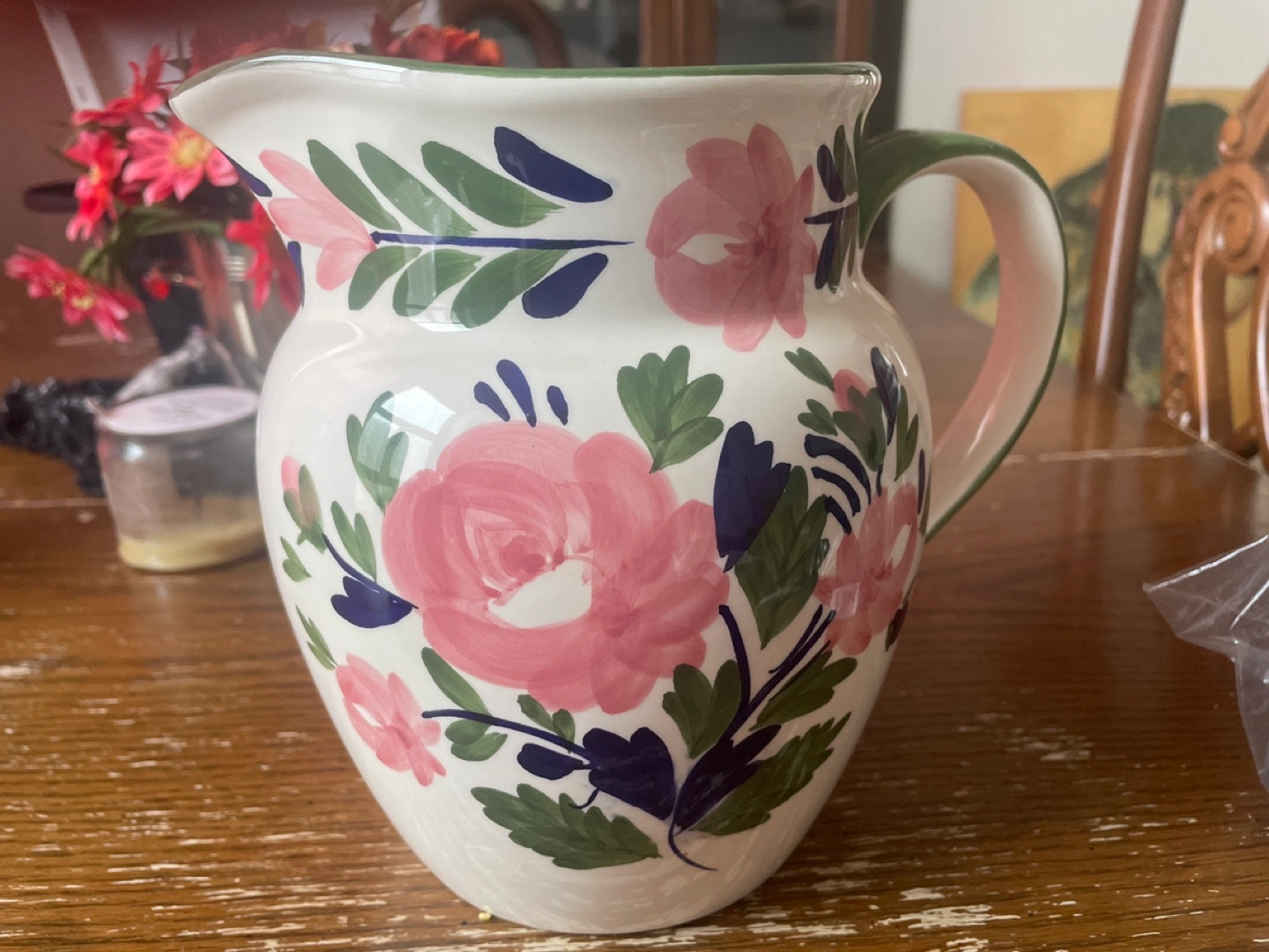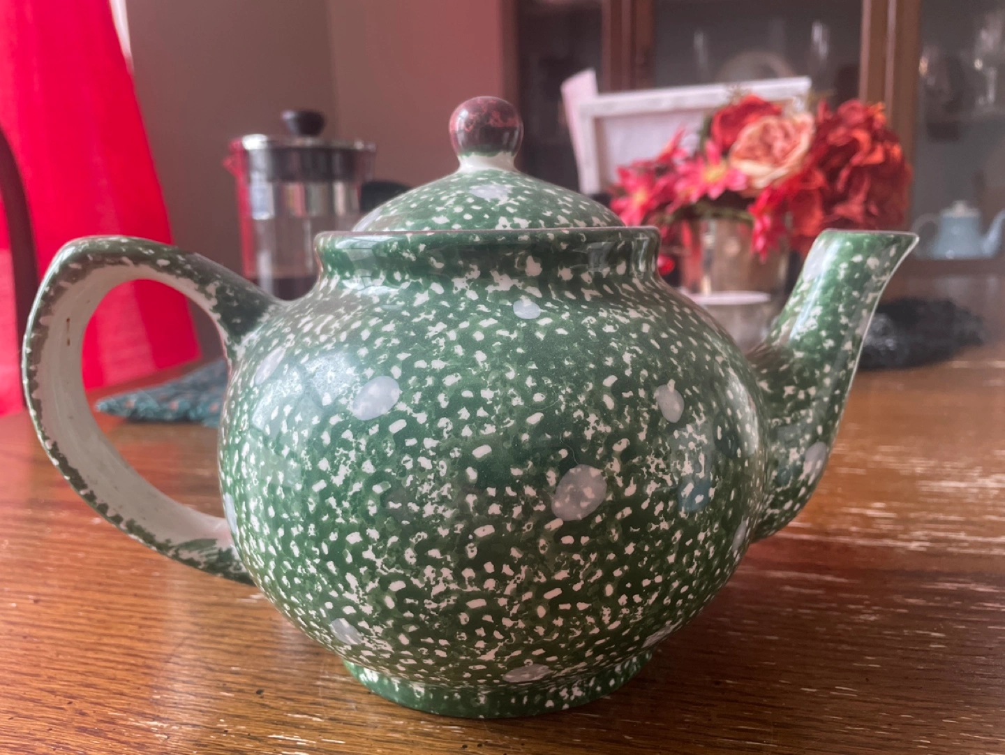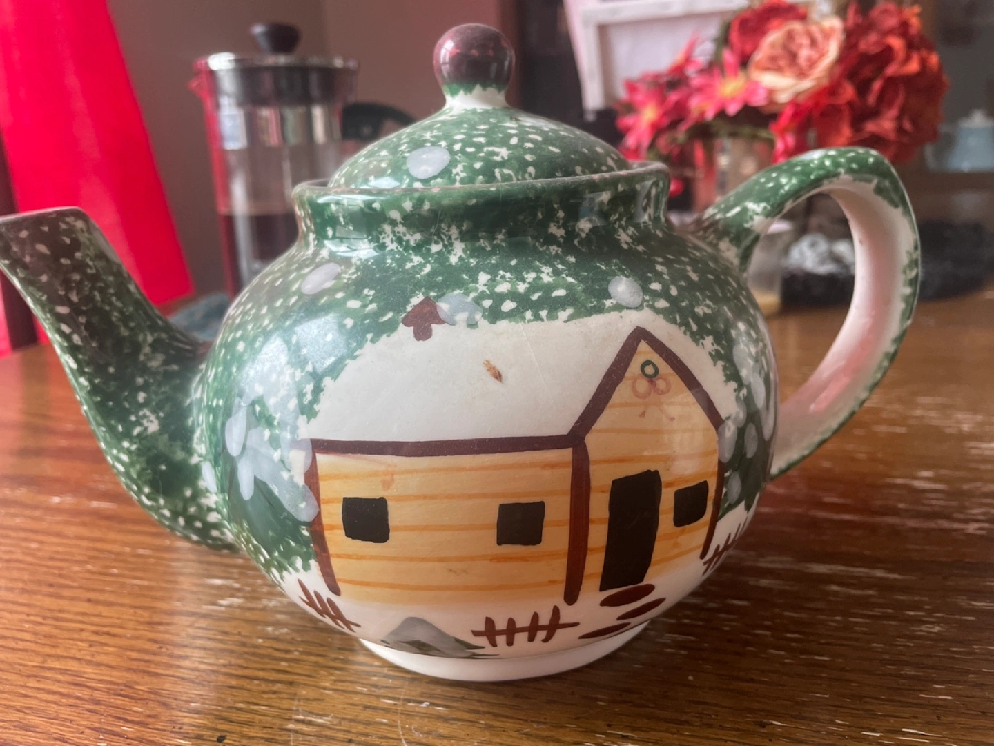 Charming vintage teapot. Green speckled design. Features a hand-painted cabin scene. Perfect for tea lovers or collectors.
