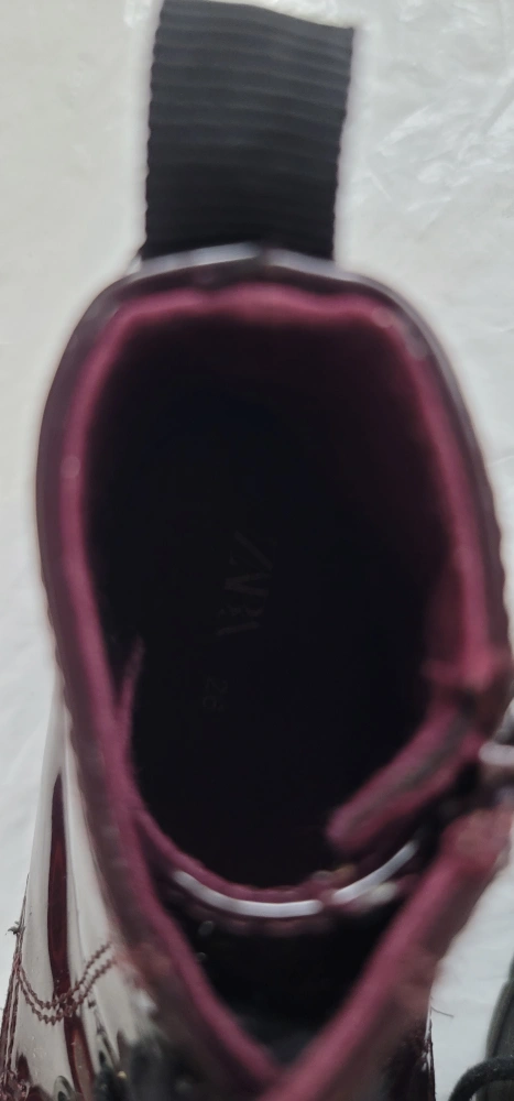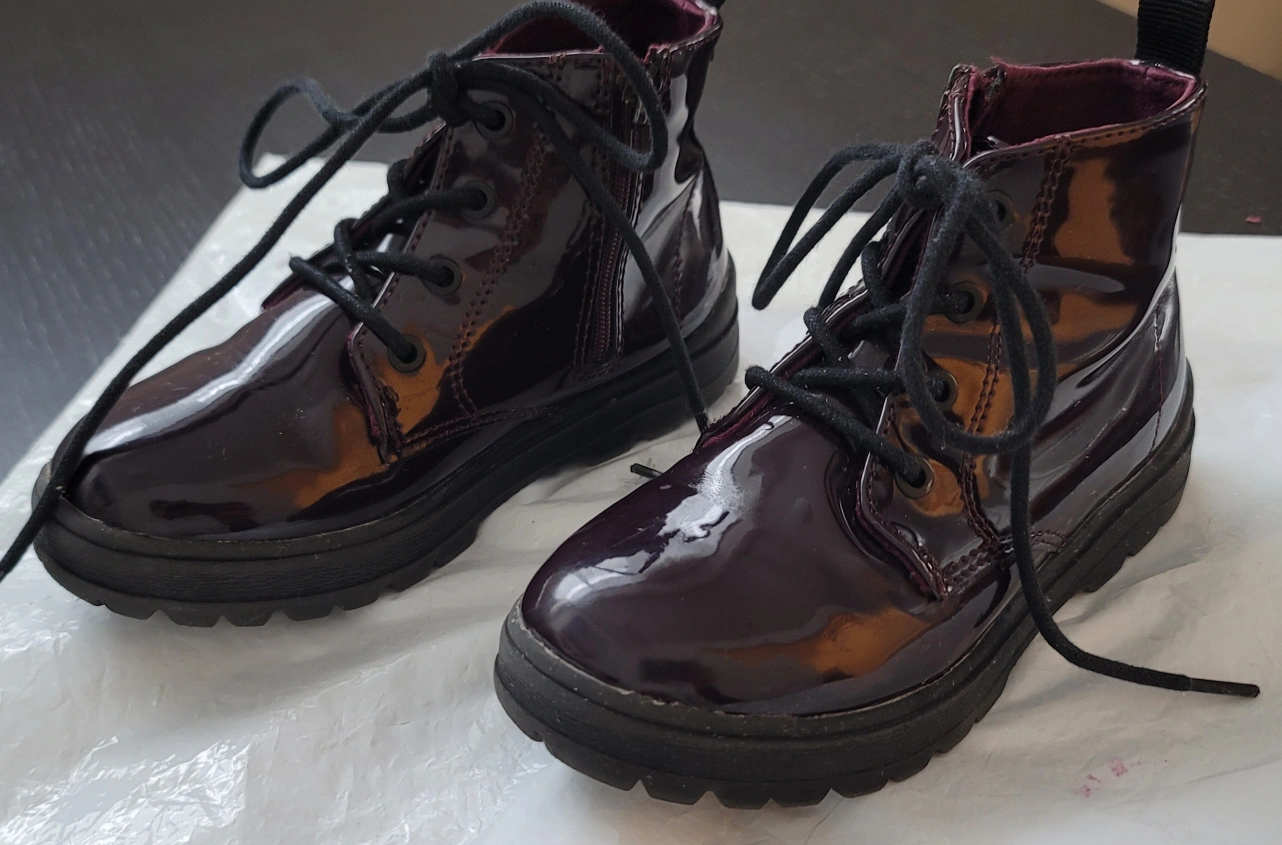 Adorable burgundy patent leather boots. Lace-up style with side zipper. Size 26. Great for fall and winter.