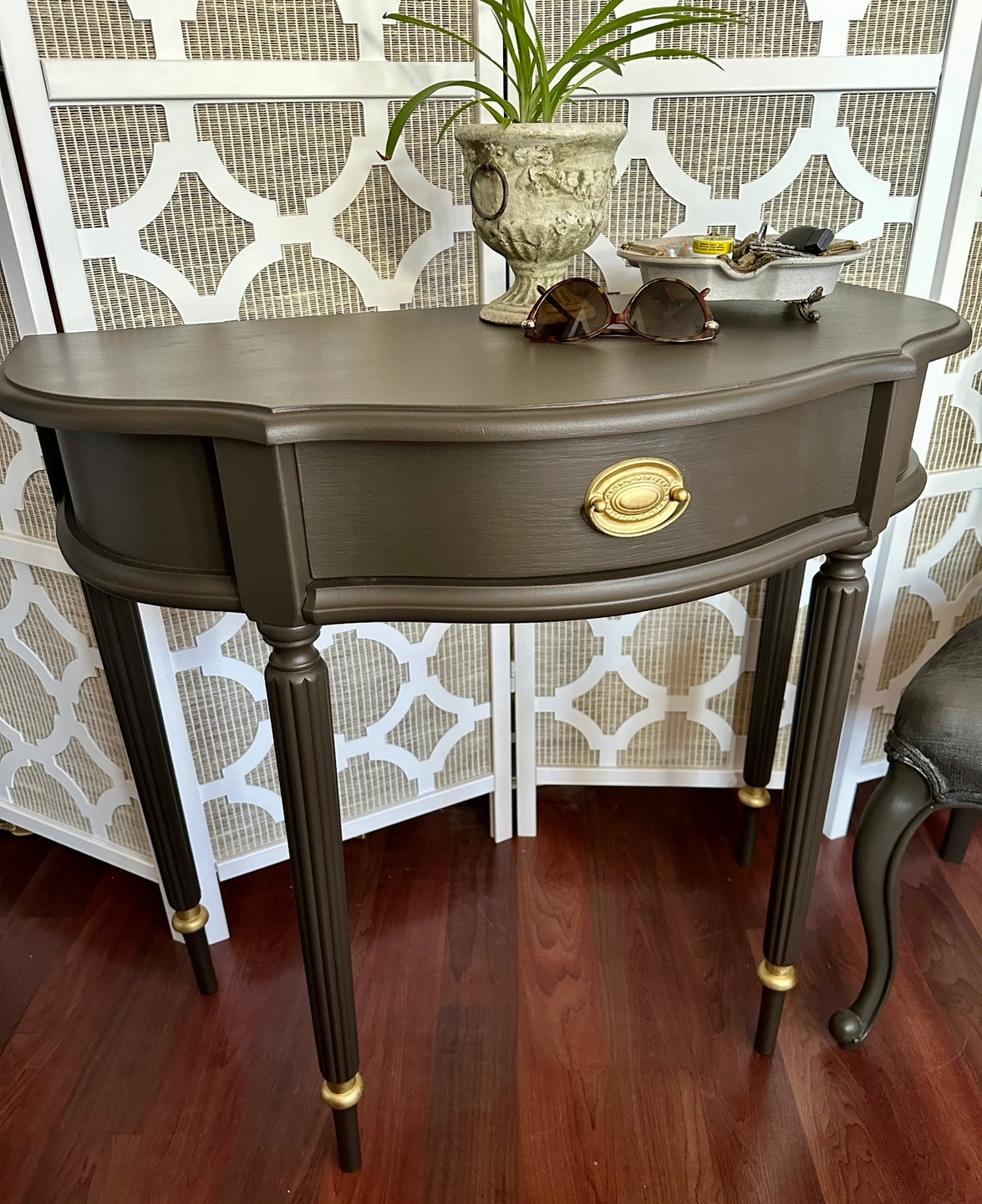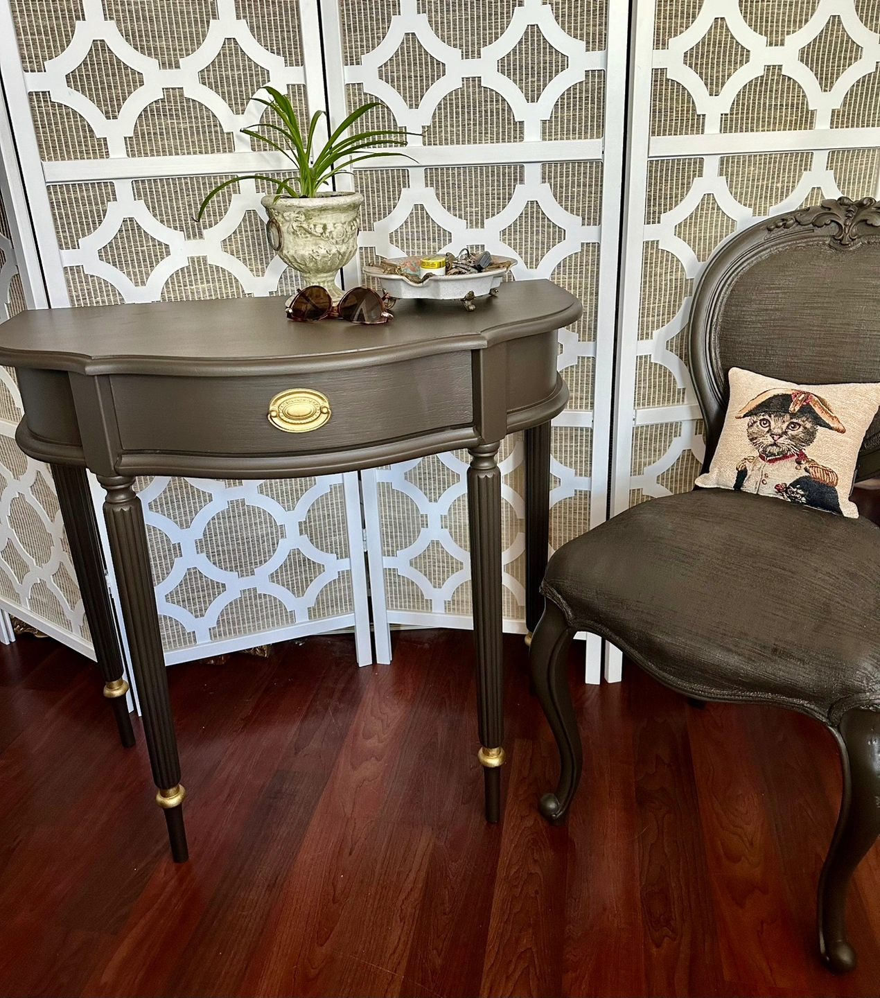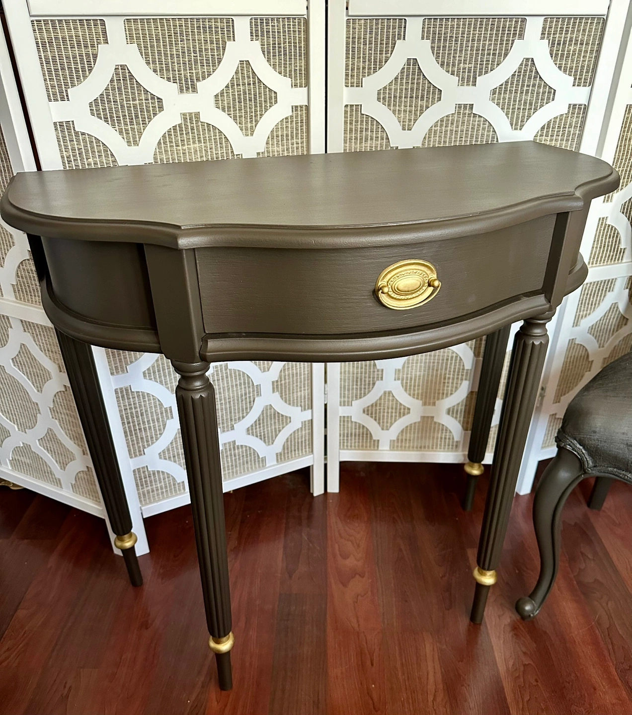 Charming half-moon console table. Refinished in a deep dark brown - near black in certain light, gold-tipped legs and drawer knob. One drawer. Perfect for entryway or living room. Unique shape. Measures about 30” high x 31” wide x 16” deep 👉🏼Pickup: Evenings, downtown Hamilton near St.Joe’s Hospital: Herkimer at James St. South 👉🏼 Pickup in Waterdown also possible. 👉🏼 Local delivery available for a small fee Check my other listings for fab finds and unique decor!