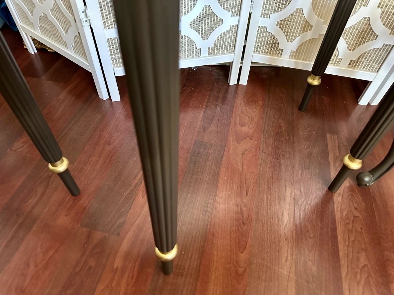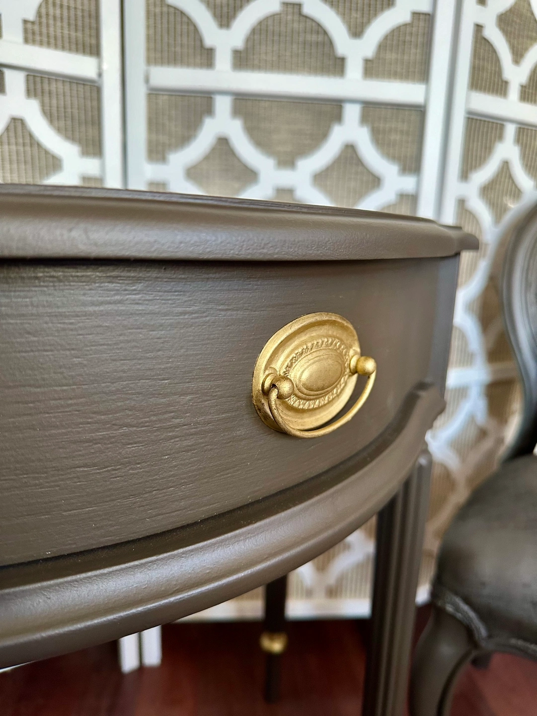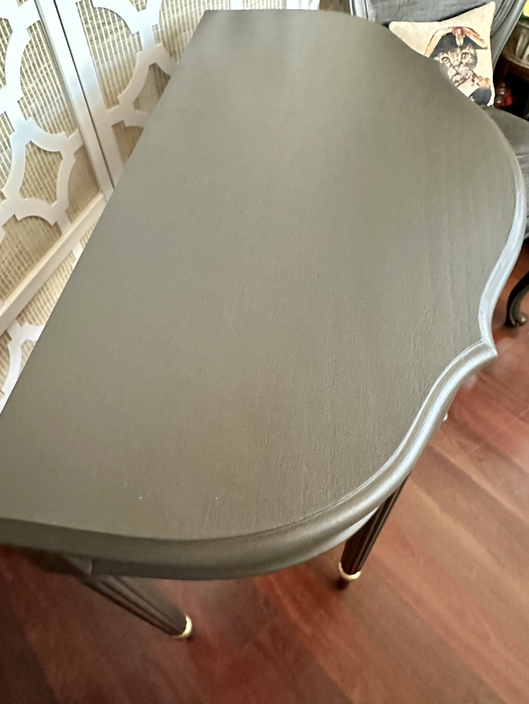 Charming half-moon console table. Refinished in a deep dark brown - near black in certain light, gold-tipped legs and drawer knob. One drawer. Perfect for entryway or living room. Unique shape. Measures about 30” high x 31” wide x 16” deep 👉🏼Pickup: Evenings, downtown Hamilton near St.Joe’s Hospital: Herkimer at James St. South 👉🏼 Pickup in Waterdown also possible. 👉🏼 Local delivery available for a small fee Check my other listings for fab finds and unique decor!