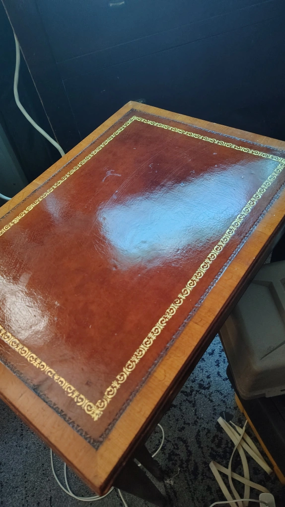 2 Small side table. Brown top. Gold trim. Wood legs. Perfect for a small space. one table slides under the other table. made by Heritage.