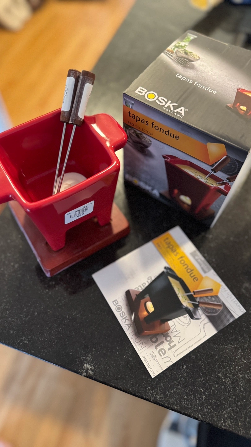 Red ceramic tapas fondue pot. Includes two fondue forks. New in box. Pro collection.