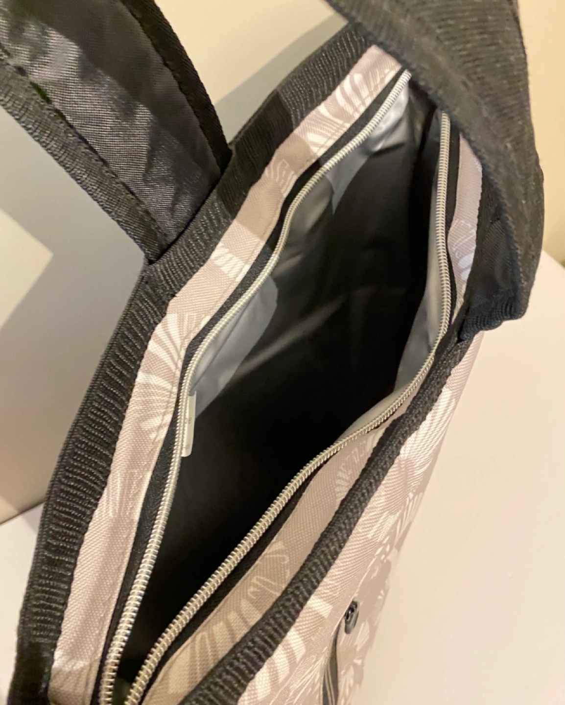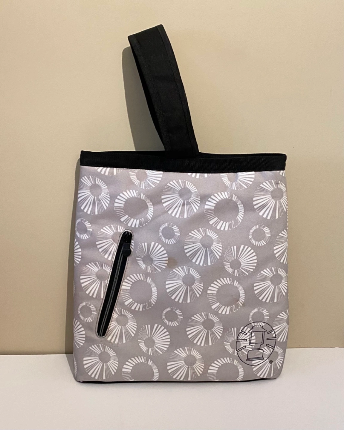 Grey and white insulated cooler sling tote bag with zipper closure and exterior pocket. Perfect for picnics or carrying chilled beverages on the go.