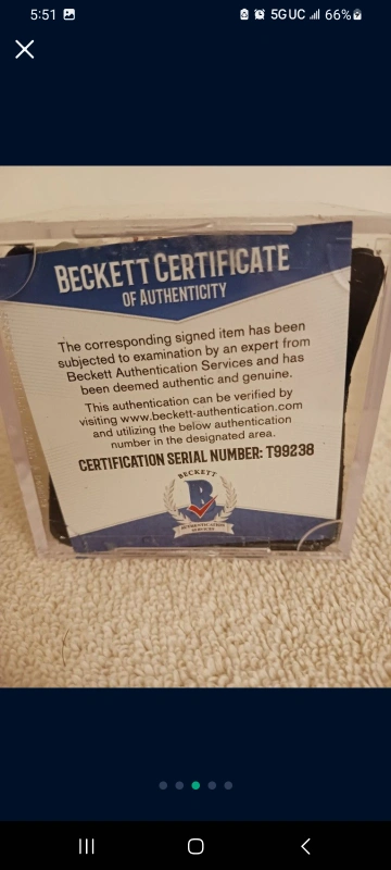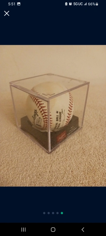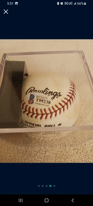 Autographed baseball in a display case. Includes Beckett Certificate of Authenticity. Serial number T99238. Rawlings ball.