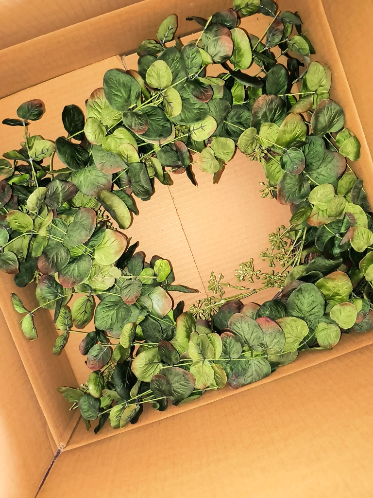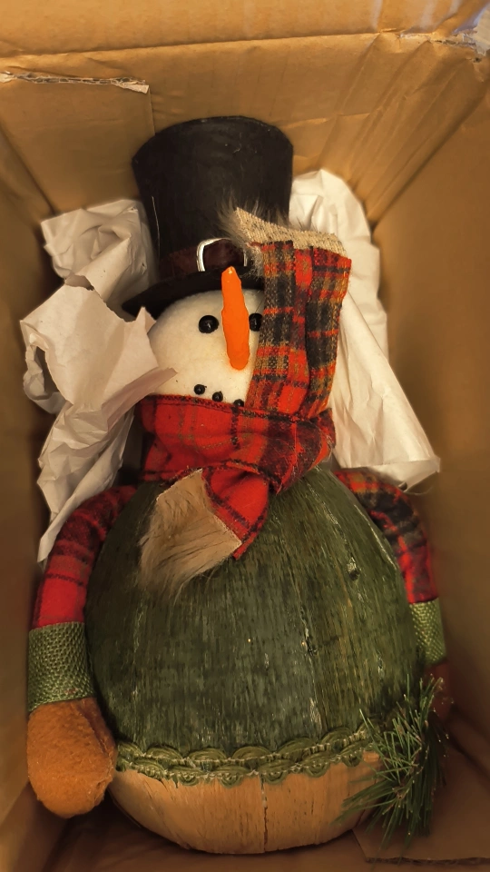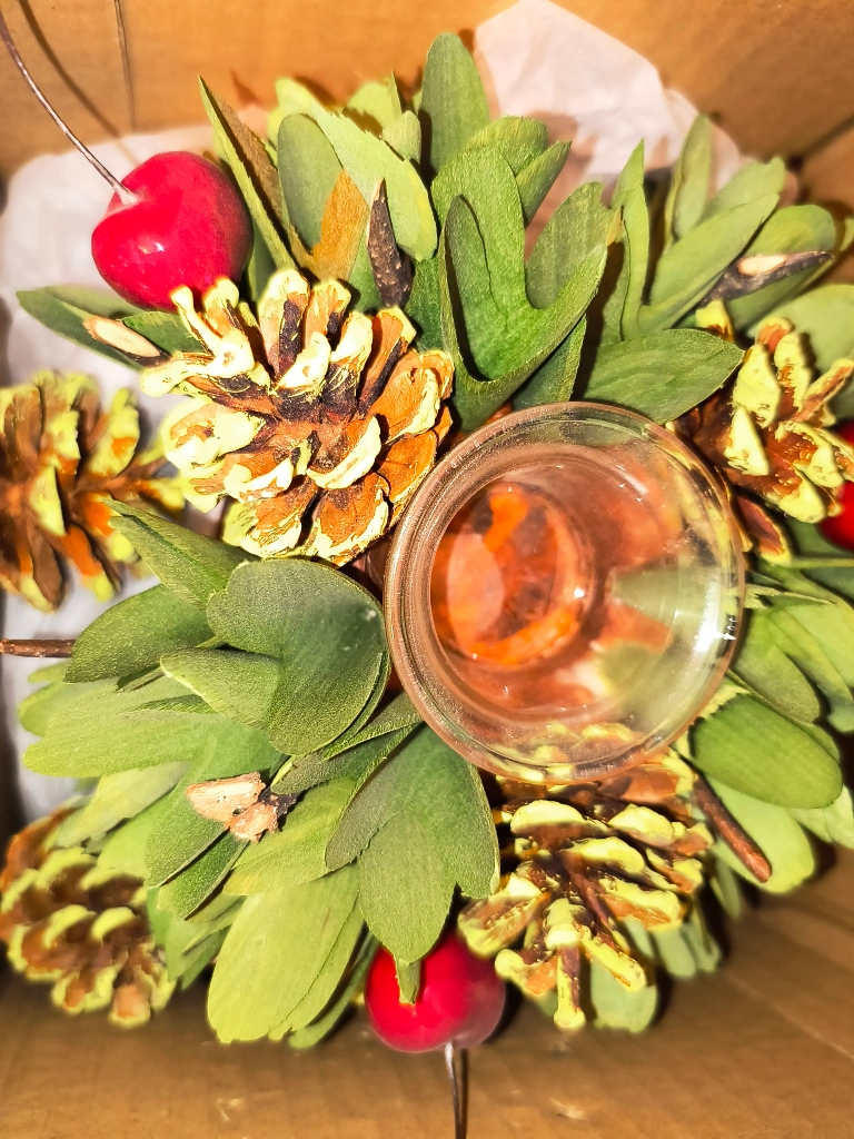 Three festive Christmas decorations. Artificial eucalyptus wreath, cute snowman figurine, and a pine cone candle holder. Perfect for holiday decorating.