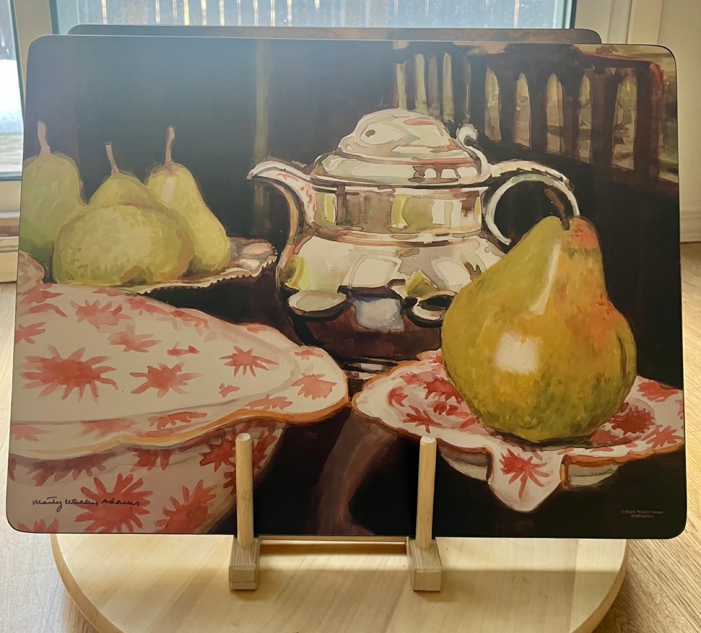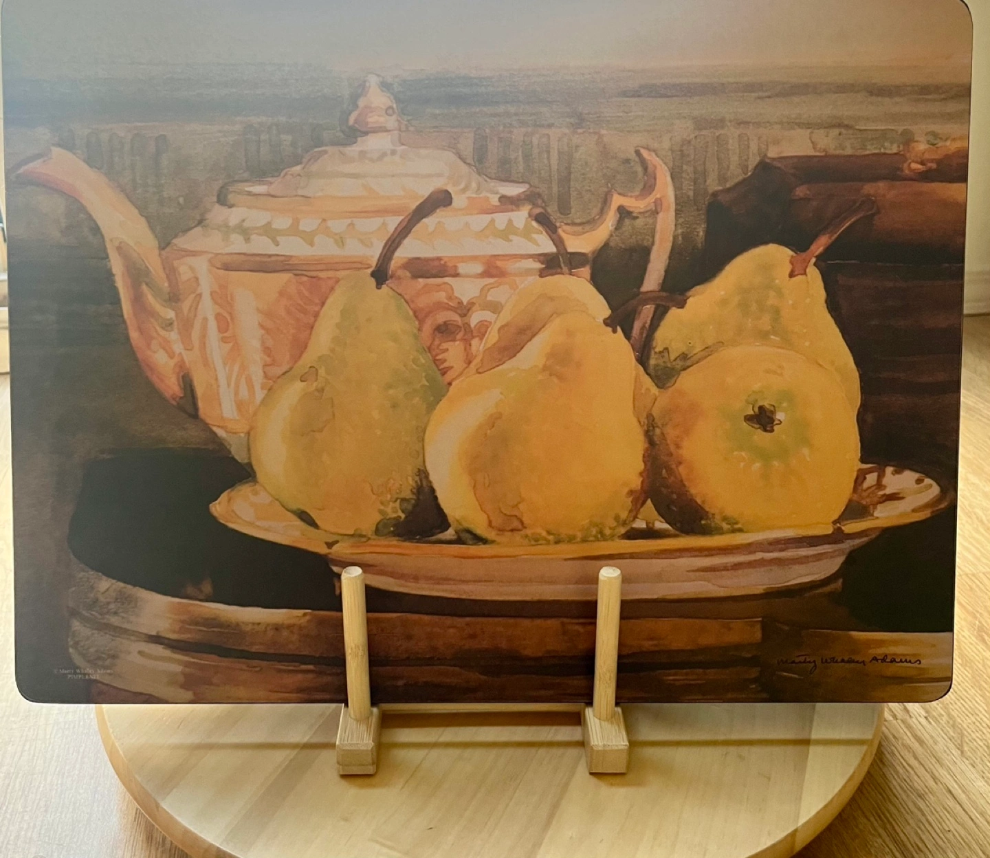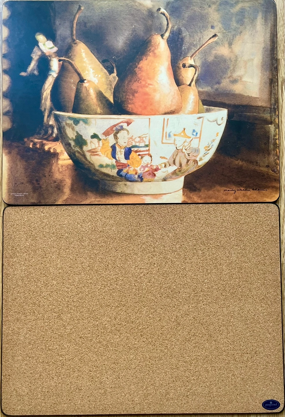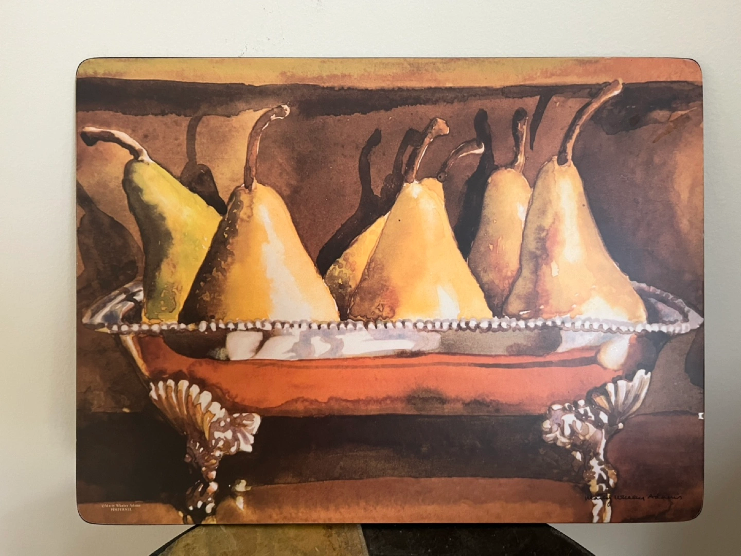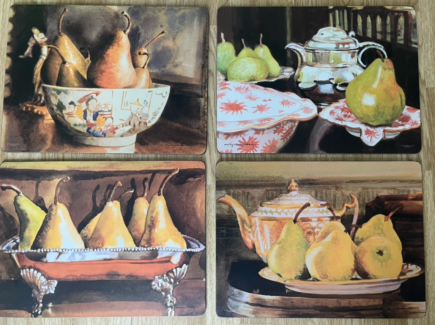 Four placemats signed by Marty Whaley Adam’s featuring watercolour paintings of pears. Cork backing.
