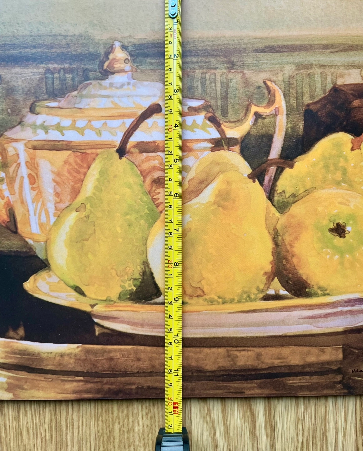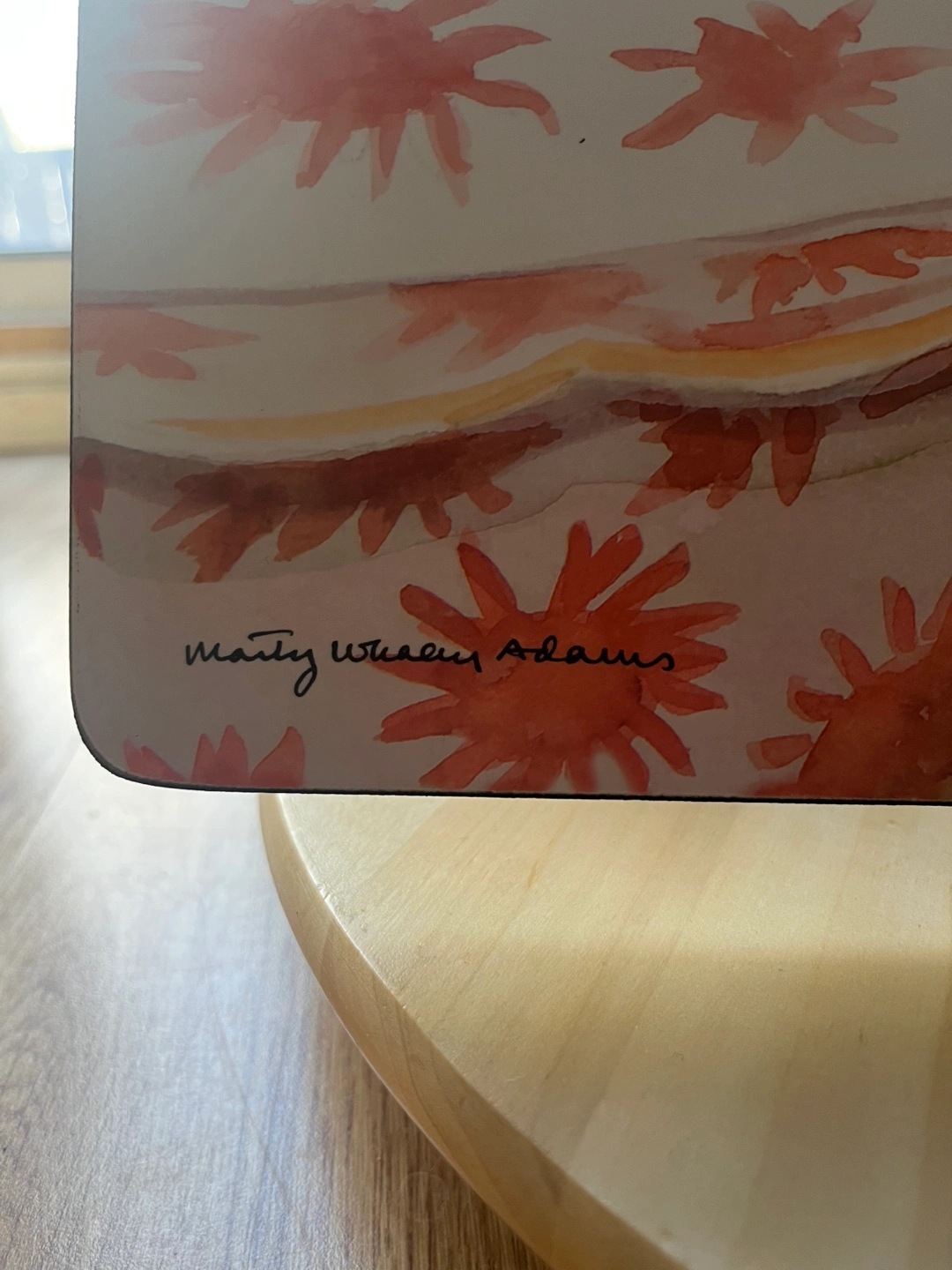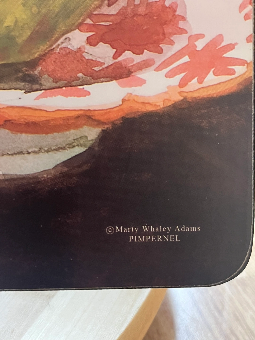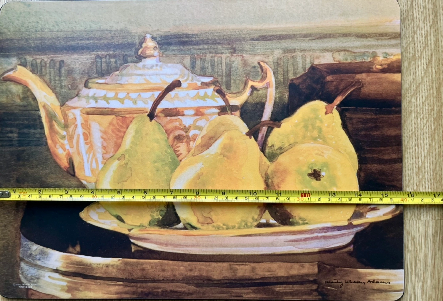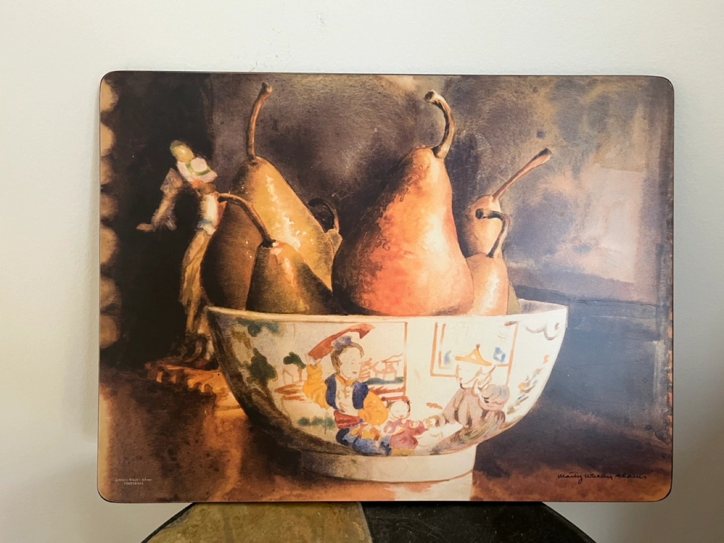 Four placemats signed by Marty Whaley Adam’s featuring watercolour paintings of pears. Cork backing.