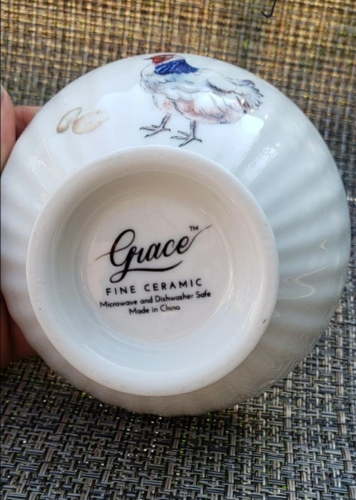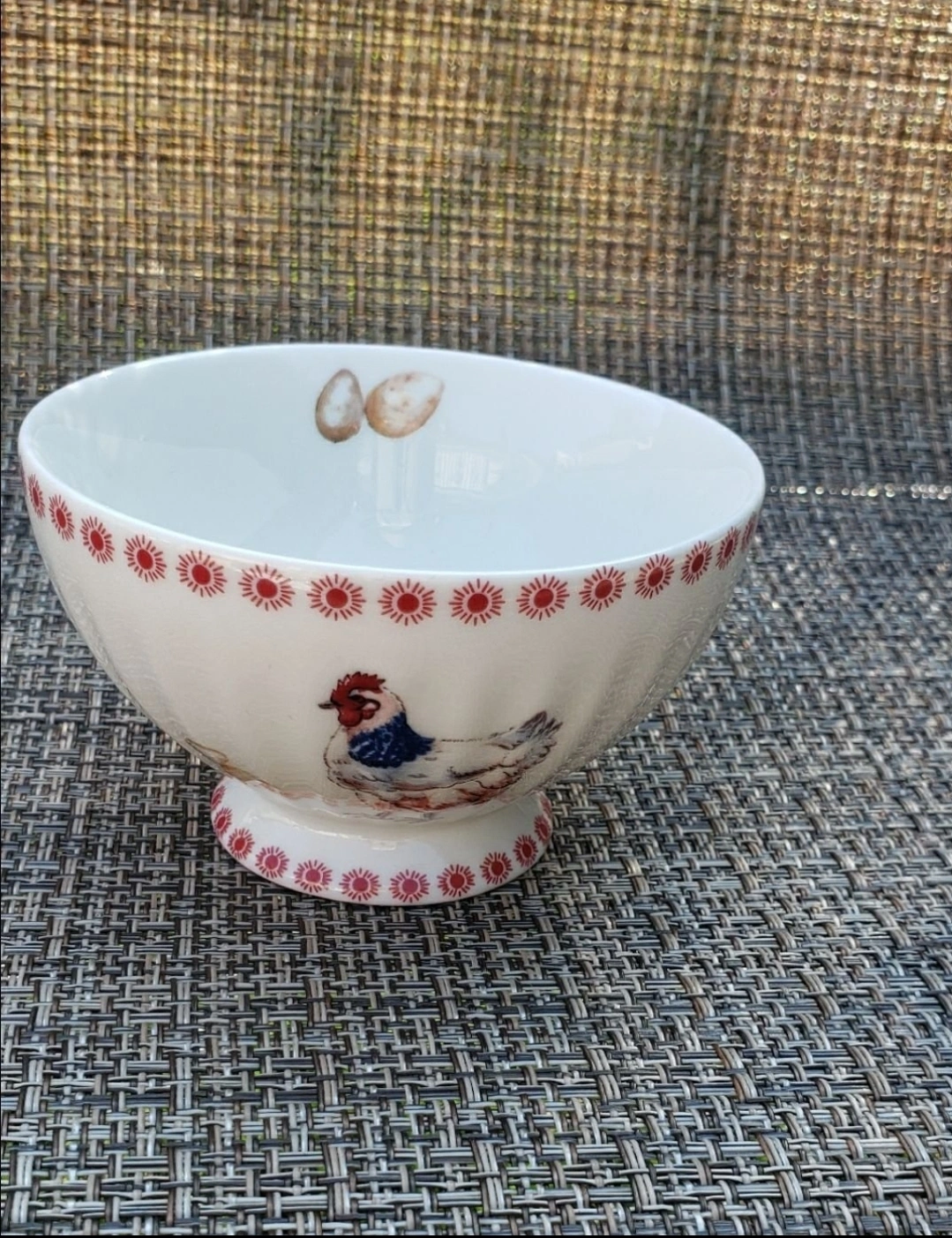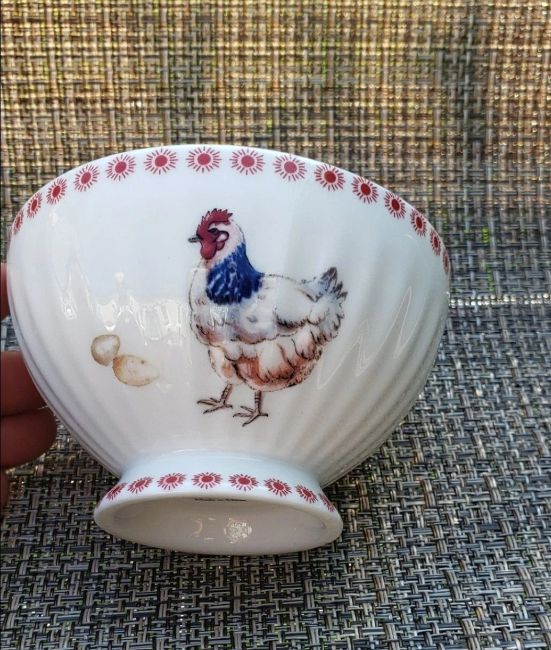 White ceramic bowl. Features a hen and eggs design. Red floral accents around the rim and base. Microwave and dishwasher safe. Made in China.
