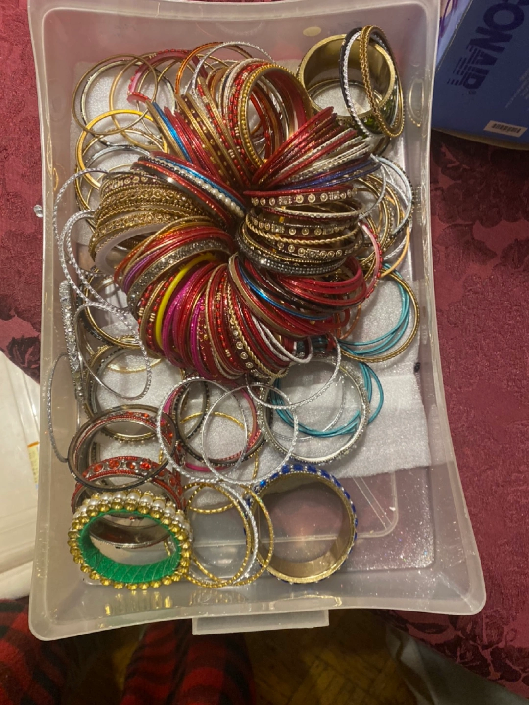 Large collection of bangles in various colours and styles. Many are metallic, some have embellishments. Perfect for crafting or personal use. Sold as a bulk lot.