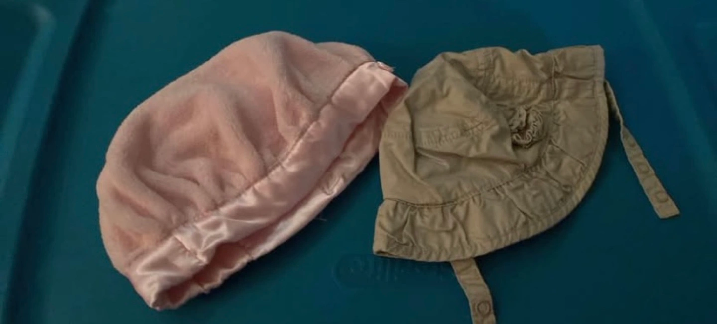 Set of two baby hats. One pink fleece hat with satin trim. One khaki sun hat with chin strap. I don’t know sizes and it’s not marked on hats. No delivery, holds, or refunds. Price is firm.