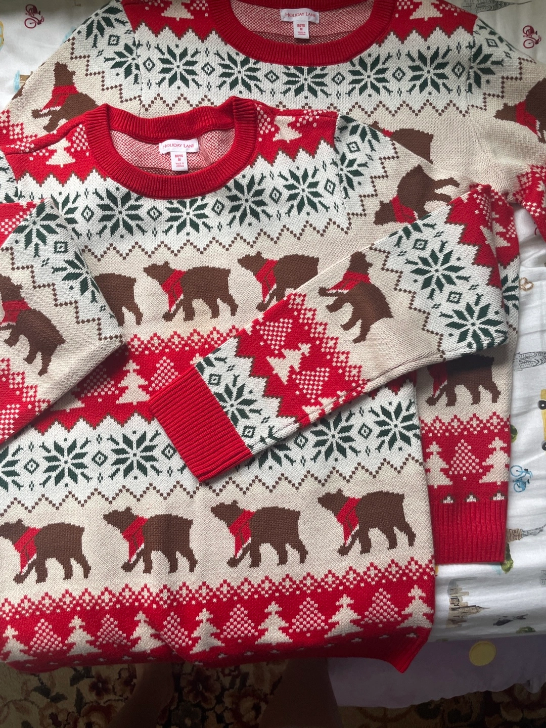 Matching Christmas sweaters. Fair isle pattern features brown bears, snowflakes, and Christmas trees. Red and cream colors. Crew neck. Long sleeves. Soft knit.