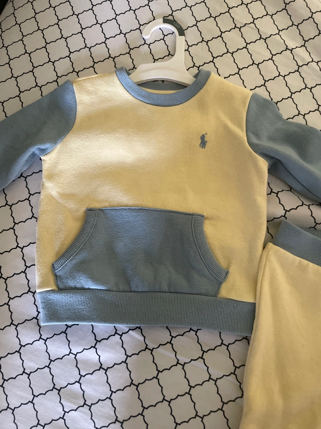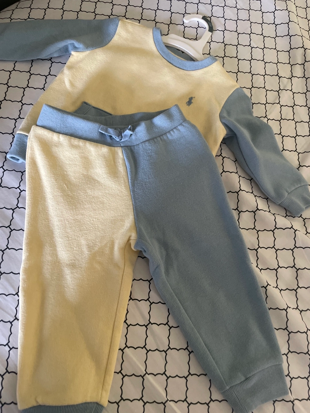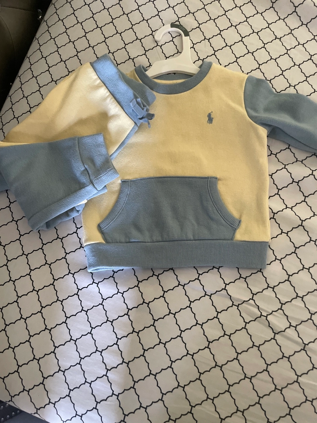 Adorable baby boys two-piece sweatsuit. Cream and light blue colorblock design. Includes sweatshirt with kangaroo pocket and matching sweatpants. Perfect for casual wear. Used gently a few times.
