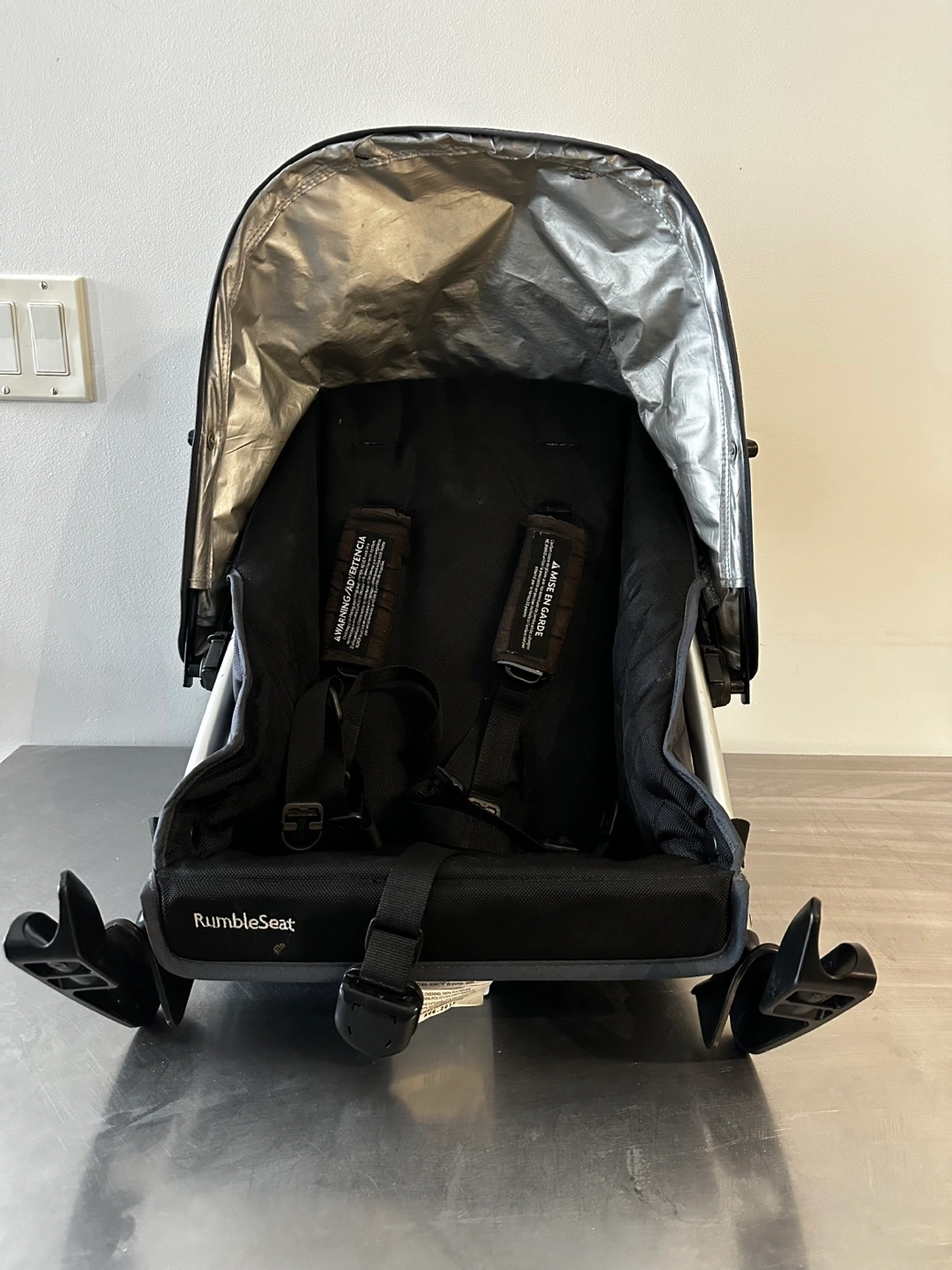 Black Rumble Seat. Bought for my 2012 UppaBaby Vista model. This is V1 so I don’t think it will fit on newer UB models but would need to look this up. Includes sunshade.