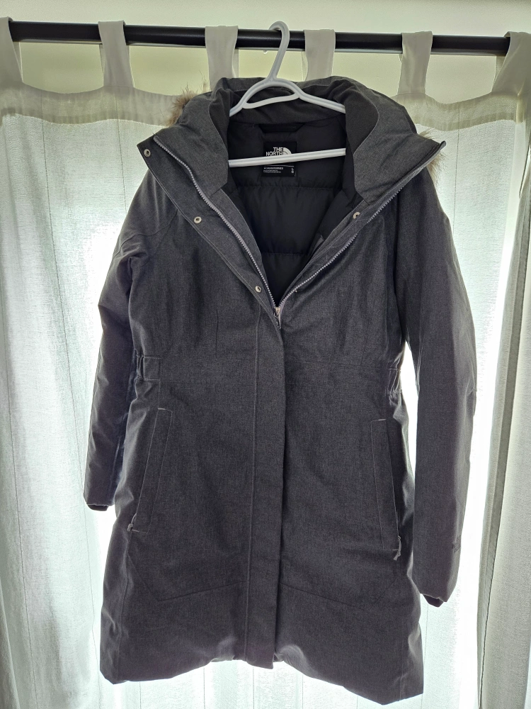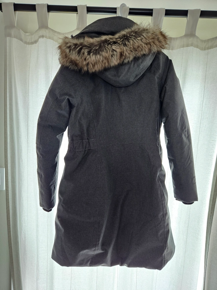 Long, grey winter parka. Features a faux fur-trimmed hood and zipper closure. Excellent for cold weather.