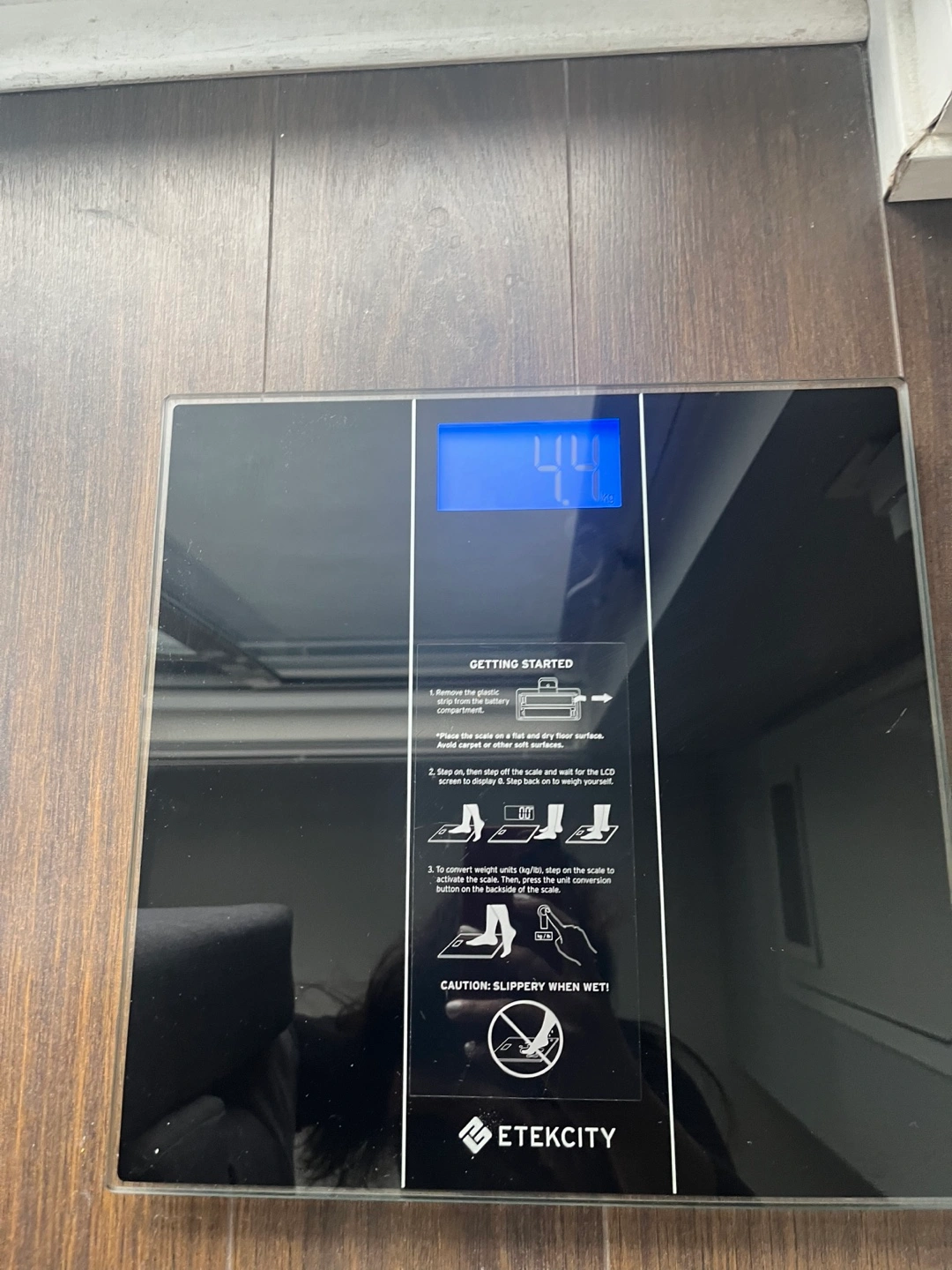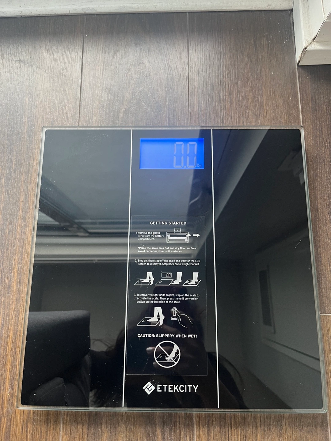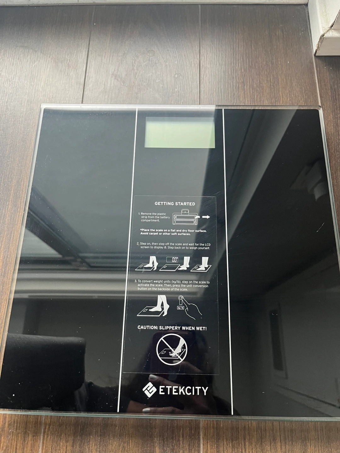Black digital bathroom weighing scale. Large LCD display. Easy to use. Measures weight in kg and lbs.