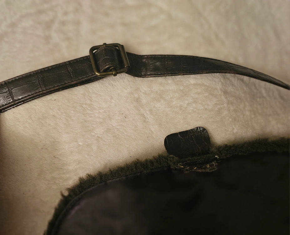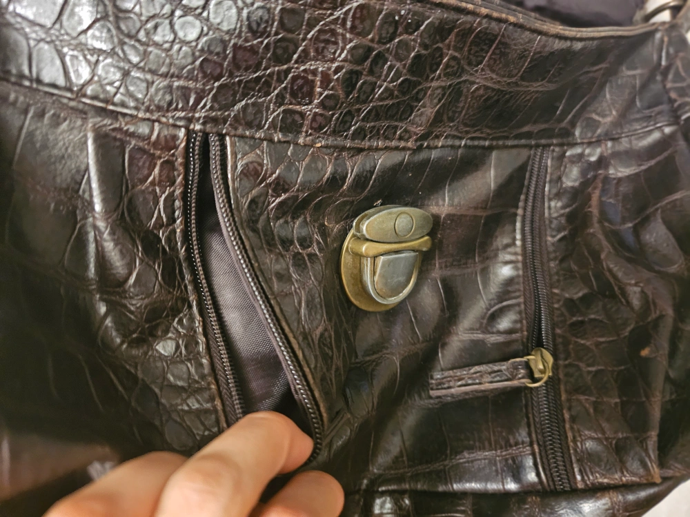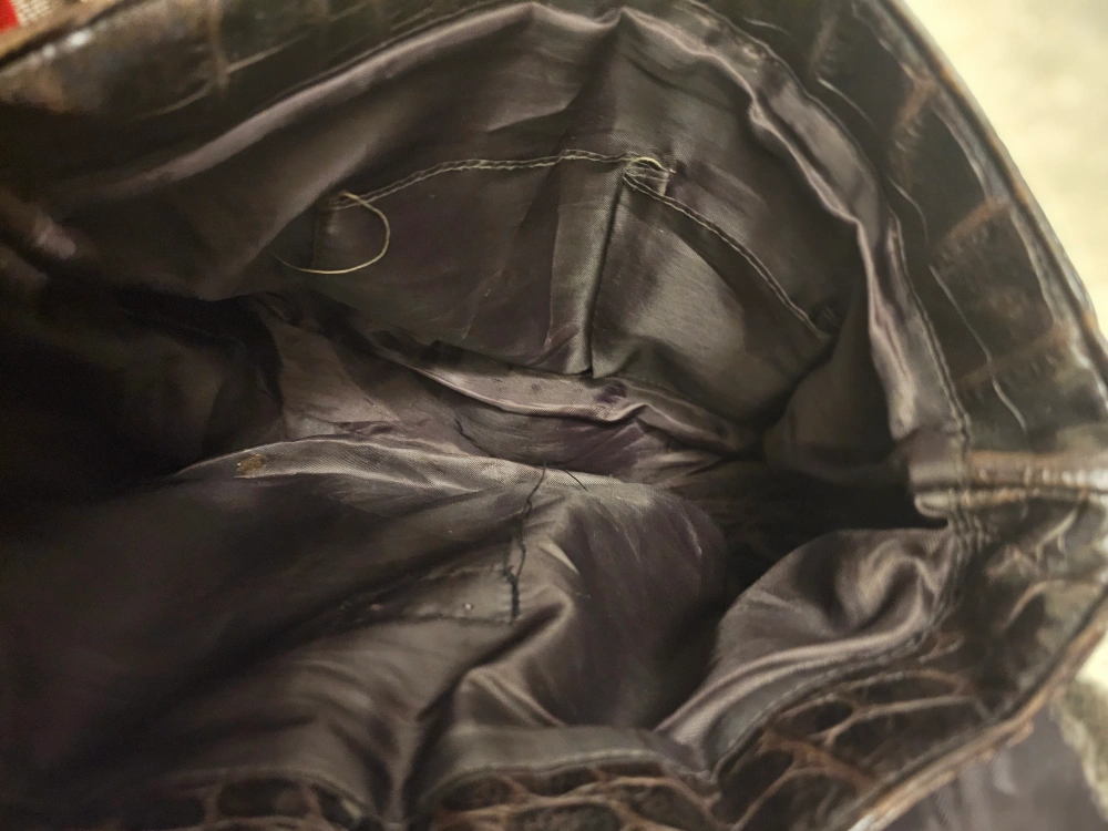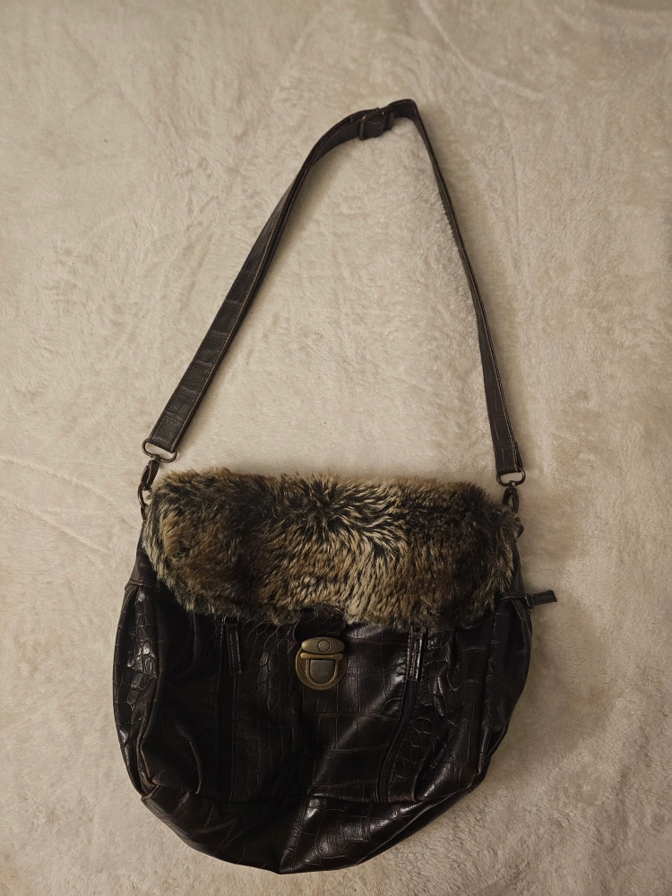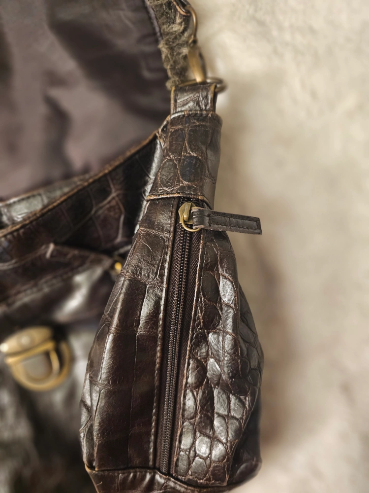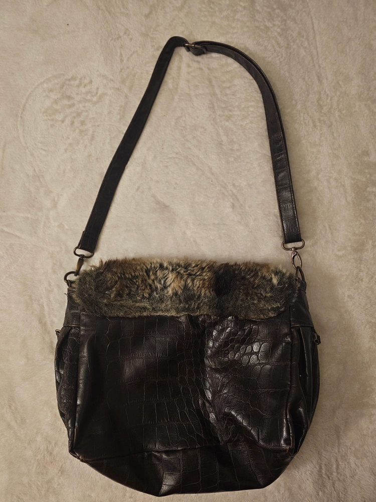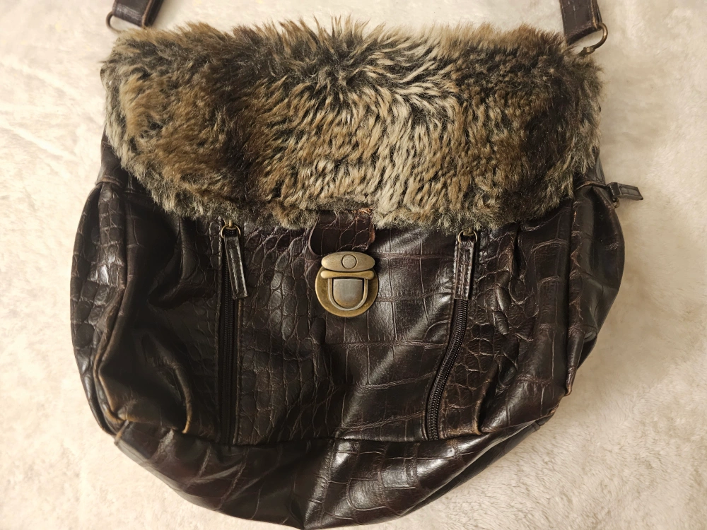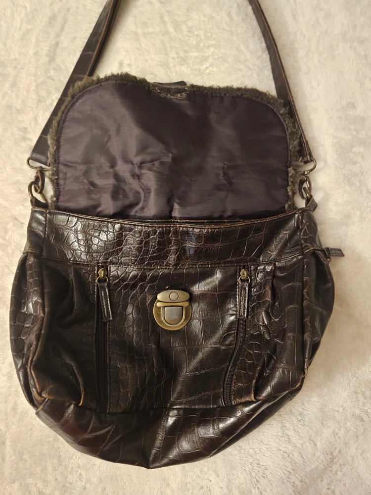 Vintage brown crossbody bag. Features crocodile-embossed faux leather, faux fur trim, and adjustable strap. Multiple pockets inside. Zipper closure. Lock is broken, has been used like this, but you can send to fix at a shop. Priced it at a good deal.
