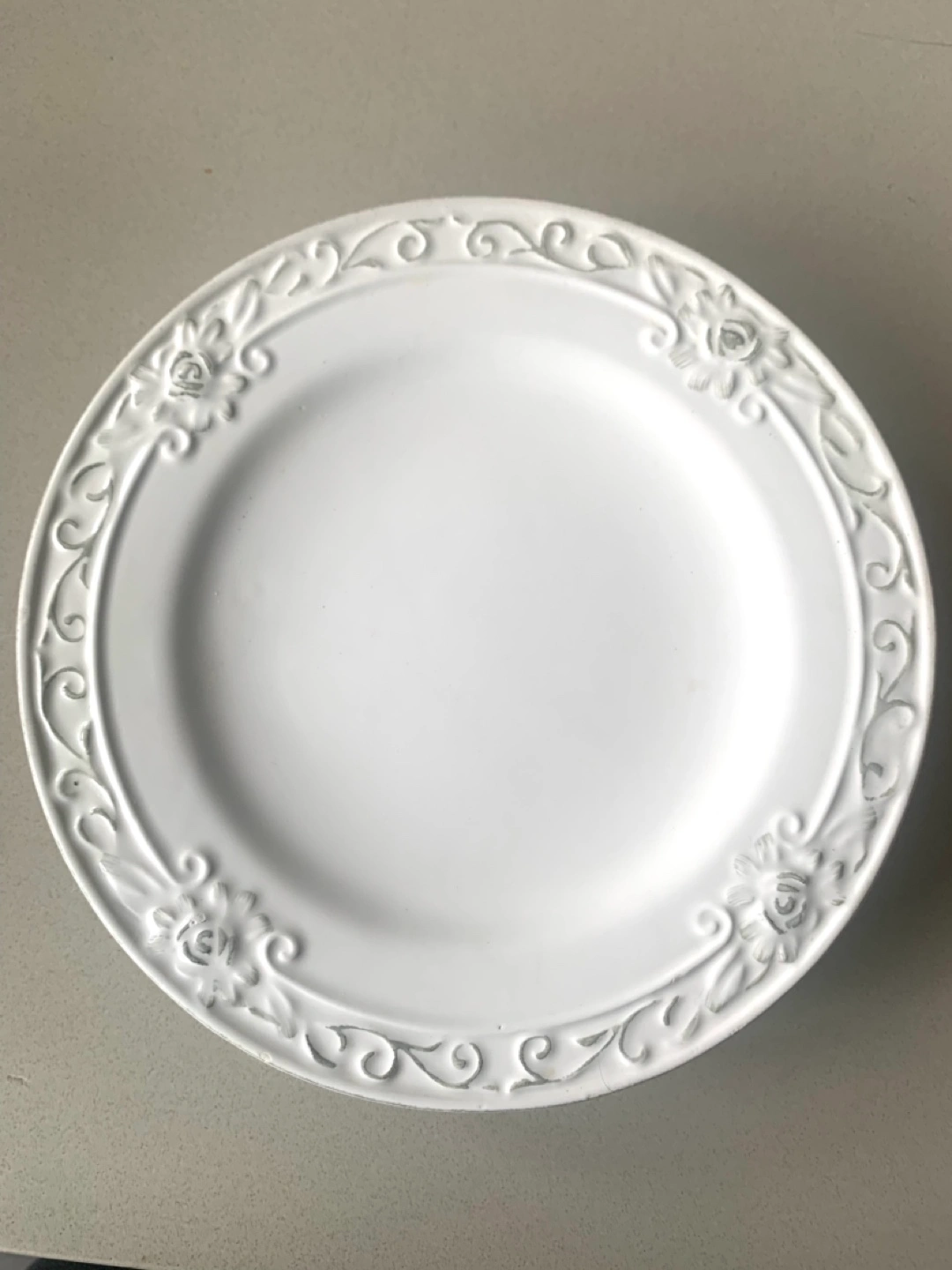 Set of three vintage white plates from the Bombay Company (no longer exists). Embossed floral design. Approximately 7.5 inches in diameter.