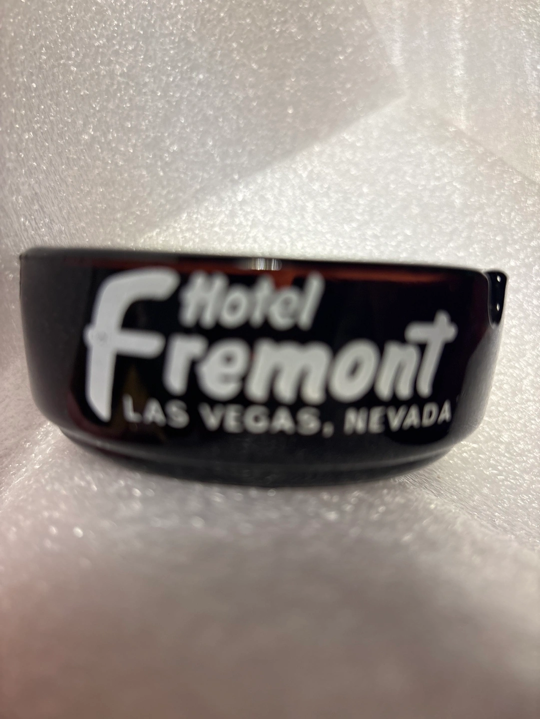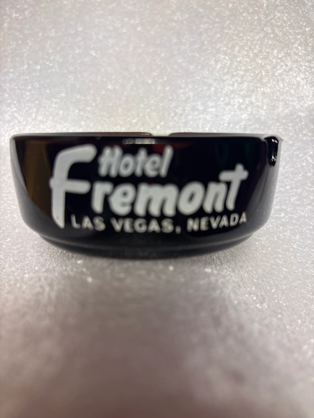Vintage hotel Fremont ashtray. Black ashtray. Hotel Fremont Las Vegas, Nevada printed on the side. Round shape.