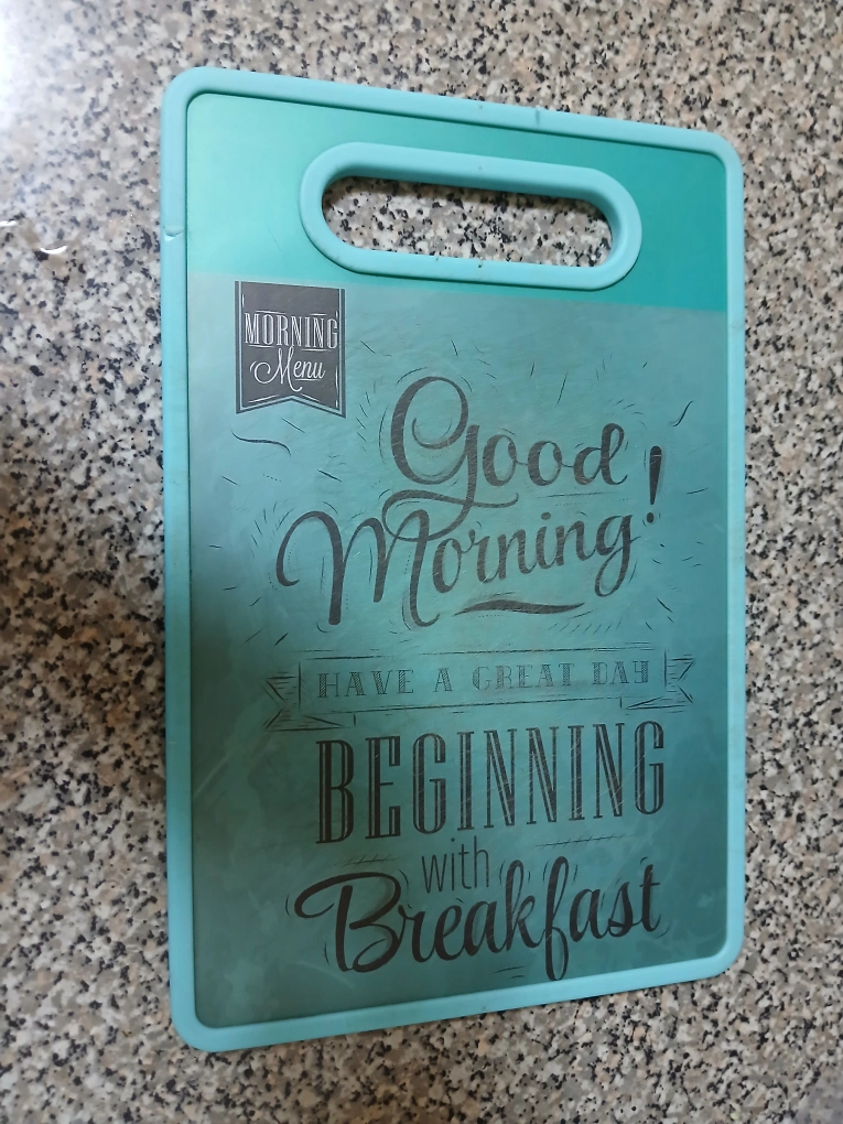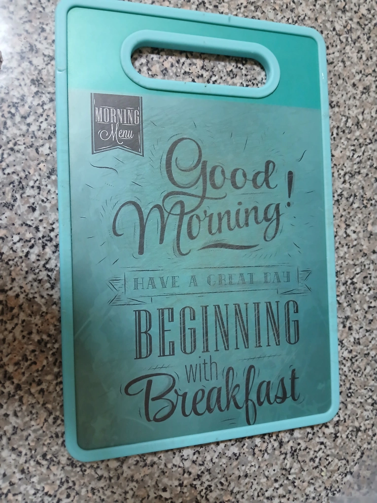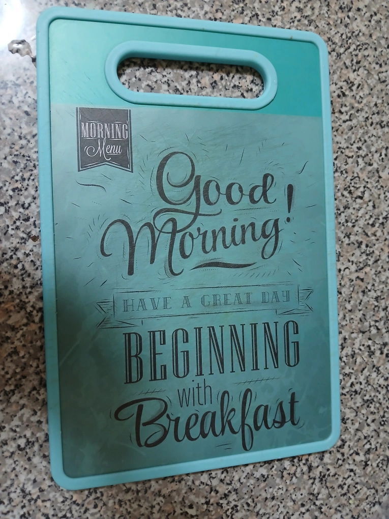 Teal cutting board. Features a design that says "Good Morning! Have a Great Day Beginning with Breakfast". Handle for easy carrying.