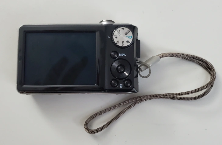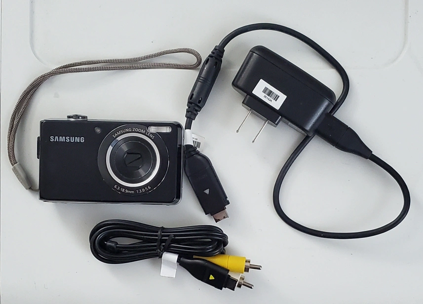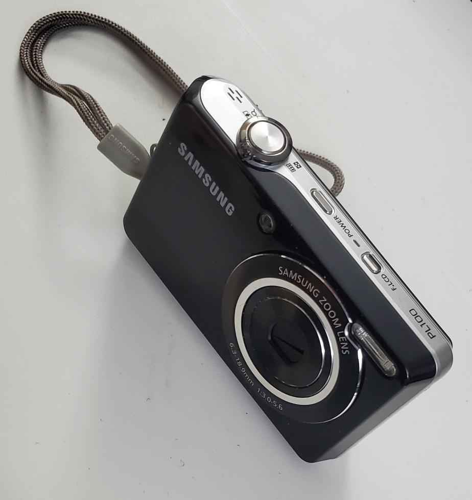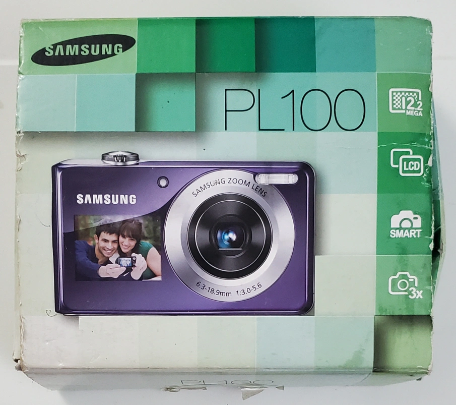 Pre-owned Samsung PL100 digital camera. Includes charger, USB cable, and AV cable. Features a 3x optical zoom lens and a 2.7-inch LCD screen. Compact and lightweight design, perfect for everyday use. Comes with wrist strap.