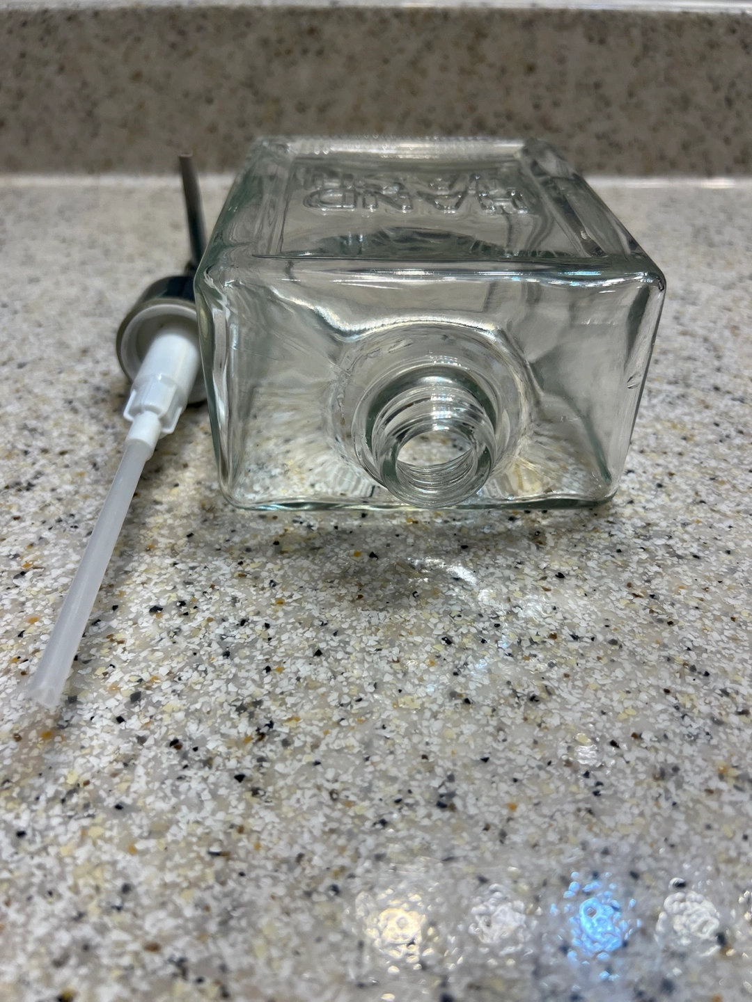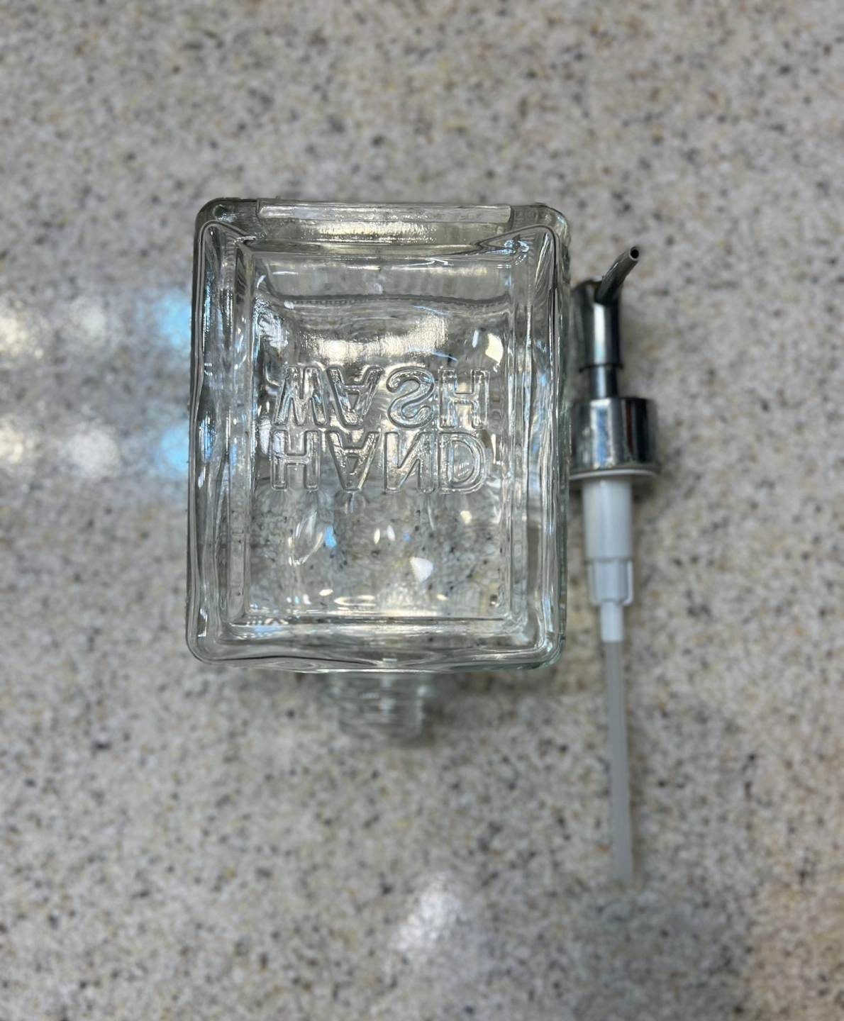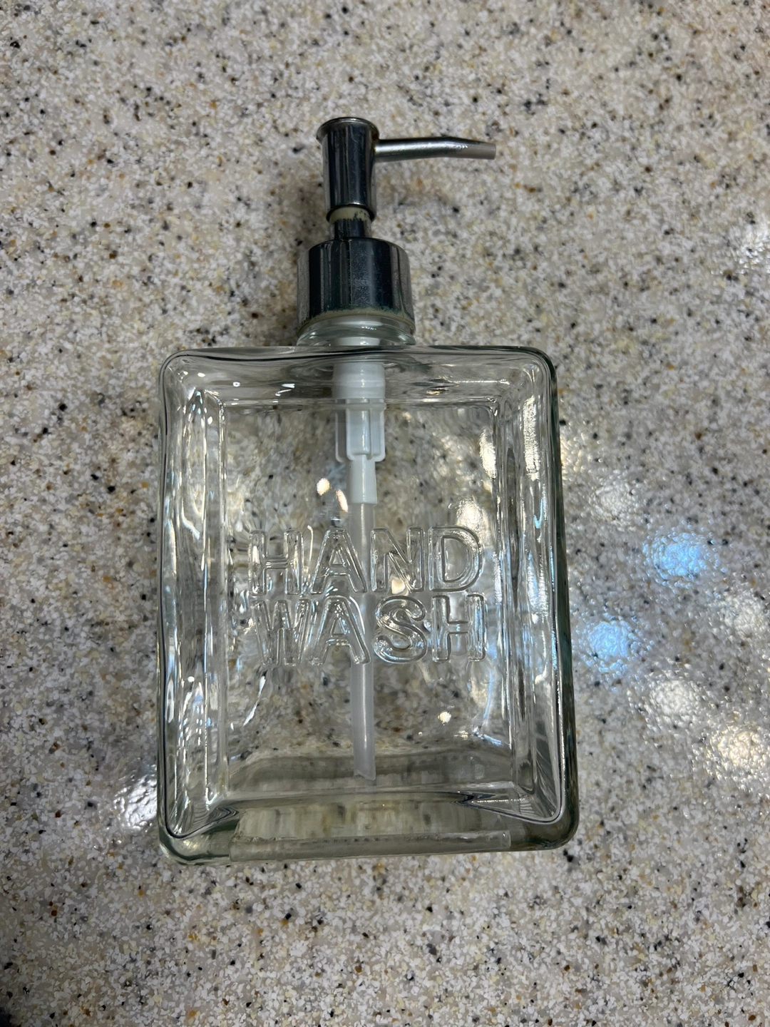 Square glass bottle. Silver metal pump. Words 'Hand Wash' etched on the front. Empty.