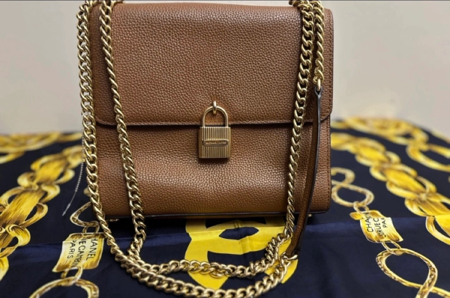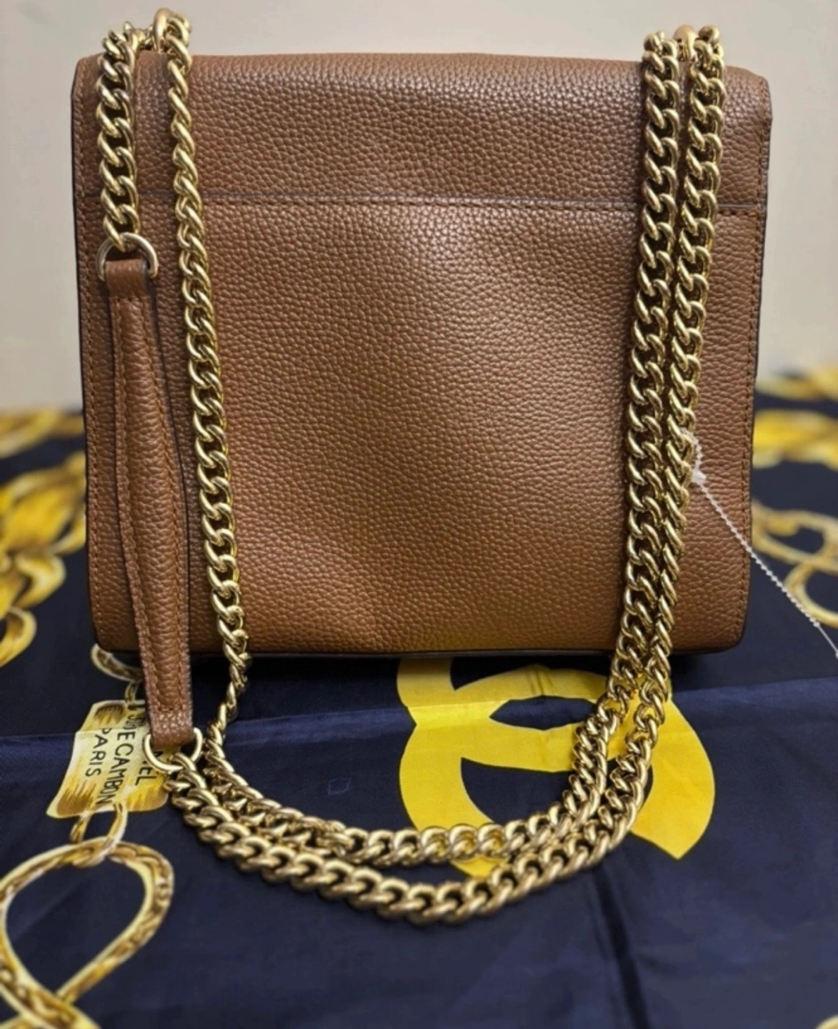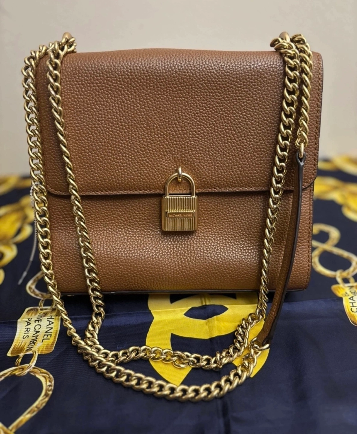 Brown leather crossbody bag. Gold chain strap and lock detail. Roomy compartment. Gently used.