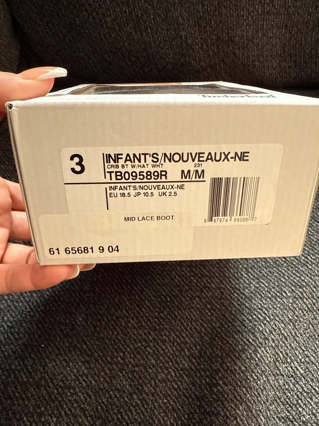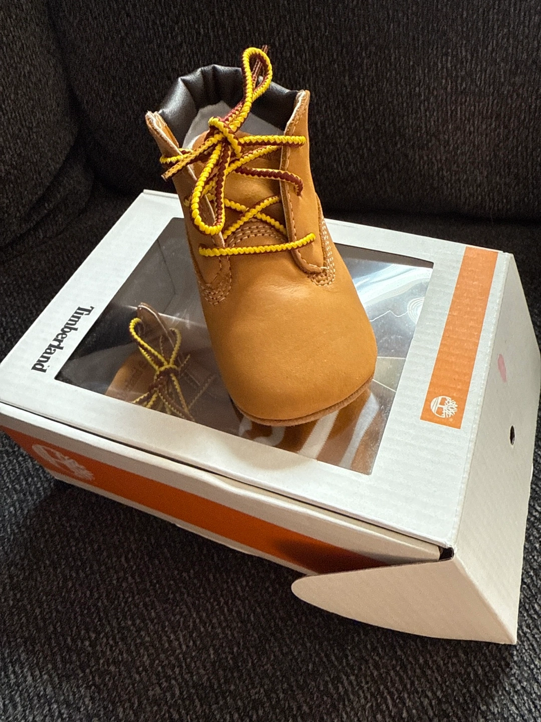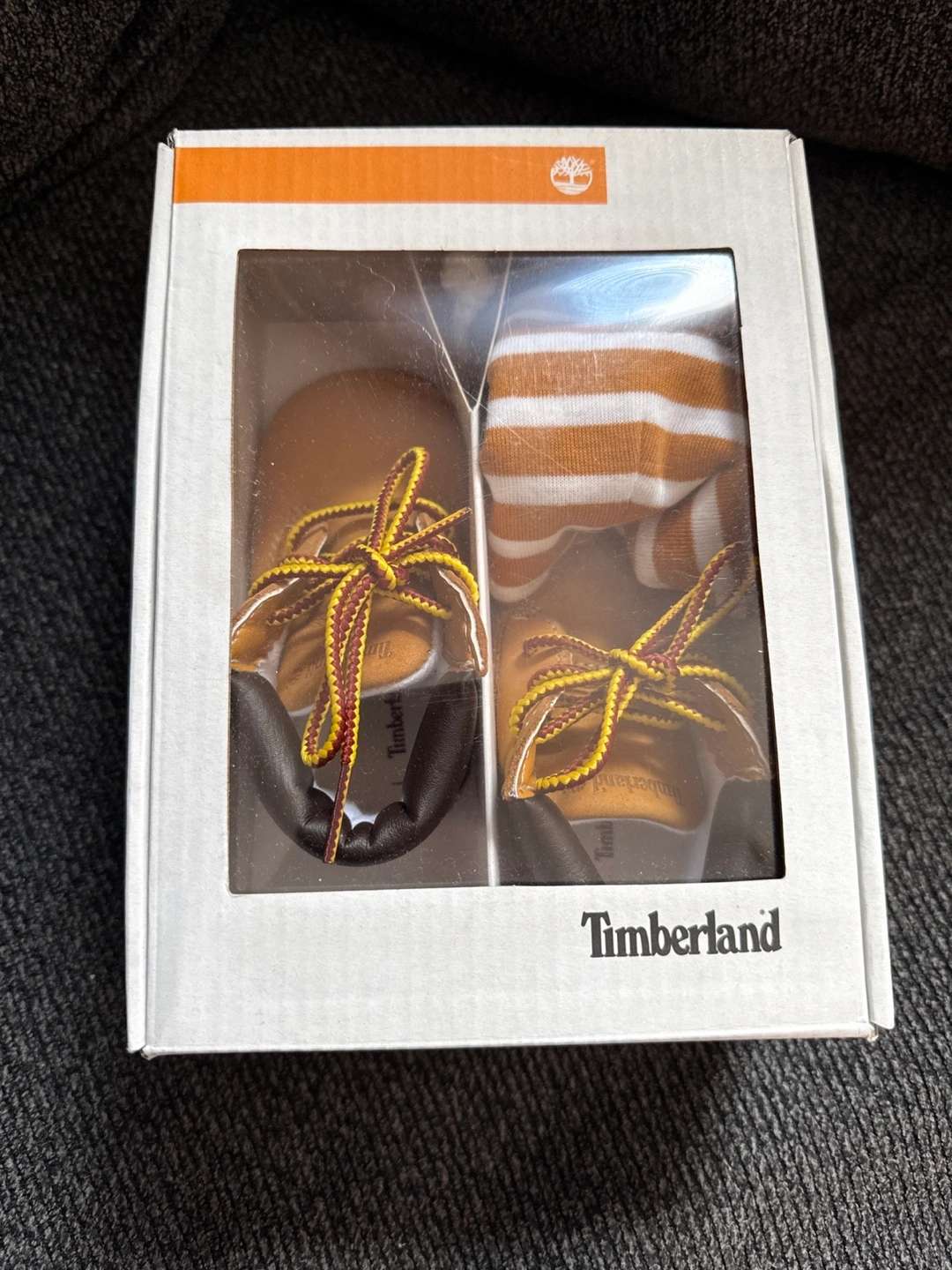 Adorable Timberland baby booties. Size 3. Includes matching socks. New in box.