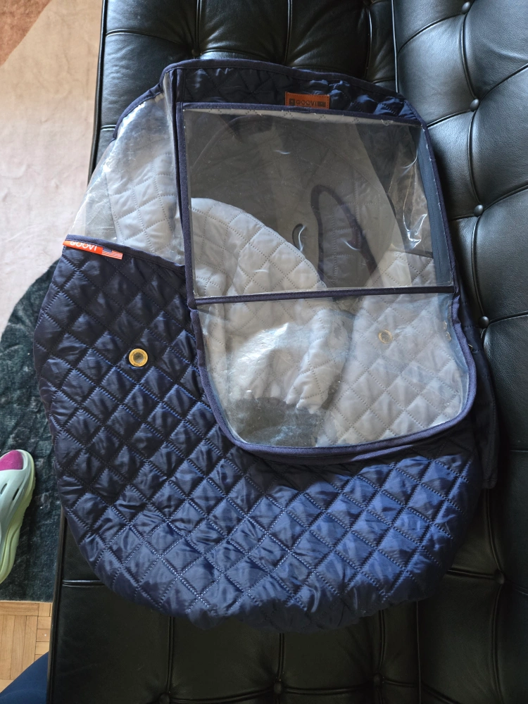 Quilted navy blue universal stroller cover. Features a clear plastic window and zipper closure. Includes adjustable straps for a secure fit. Gently used, great condition aside from a couple bend marks on the plastic screen (pictured)