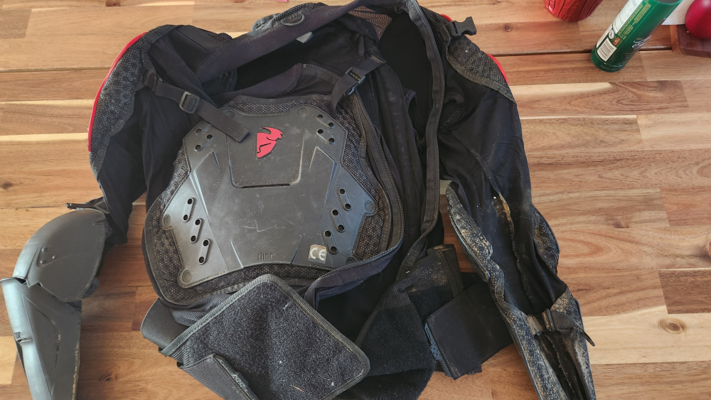Pre-owned Leatt motocross body armour. Includes chest protector, elbow guards, and back protector. Shows some wear and tear from use. Good condition, ready for action.