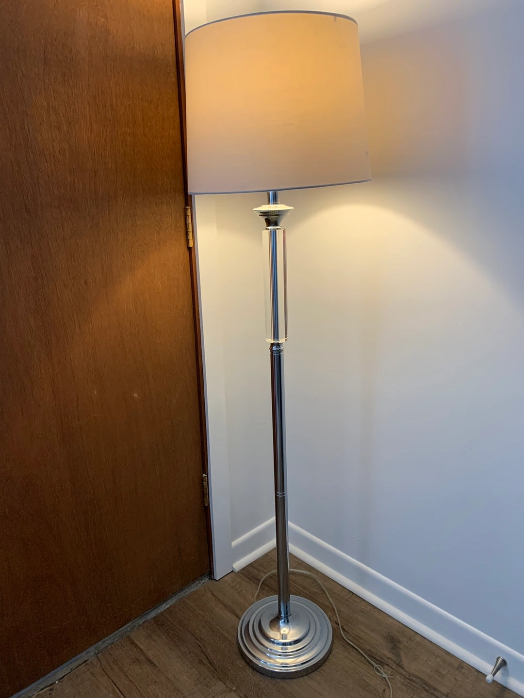 Stylish floor lamp. Features a chrome base and stem, accented by an acrylic column. Includes a beige fabric lampshade. Great addition to any living room or bedroom.