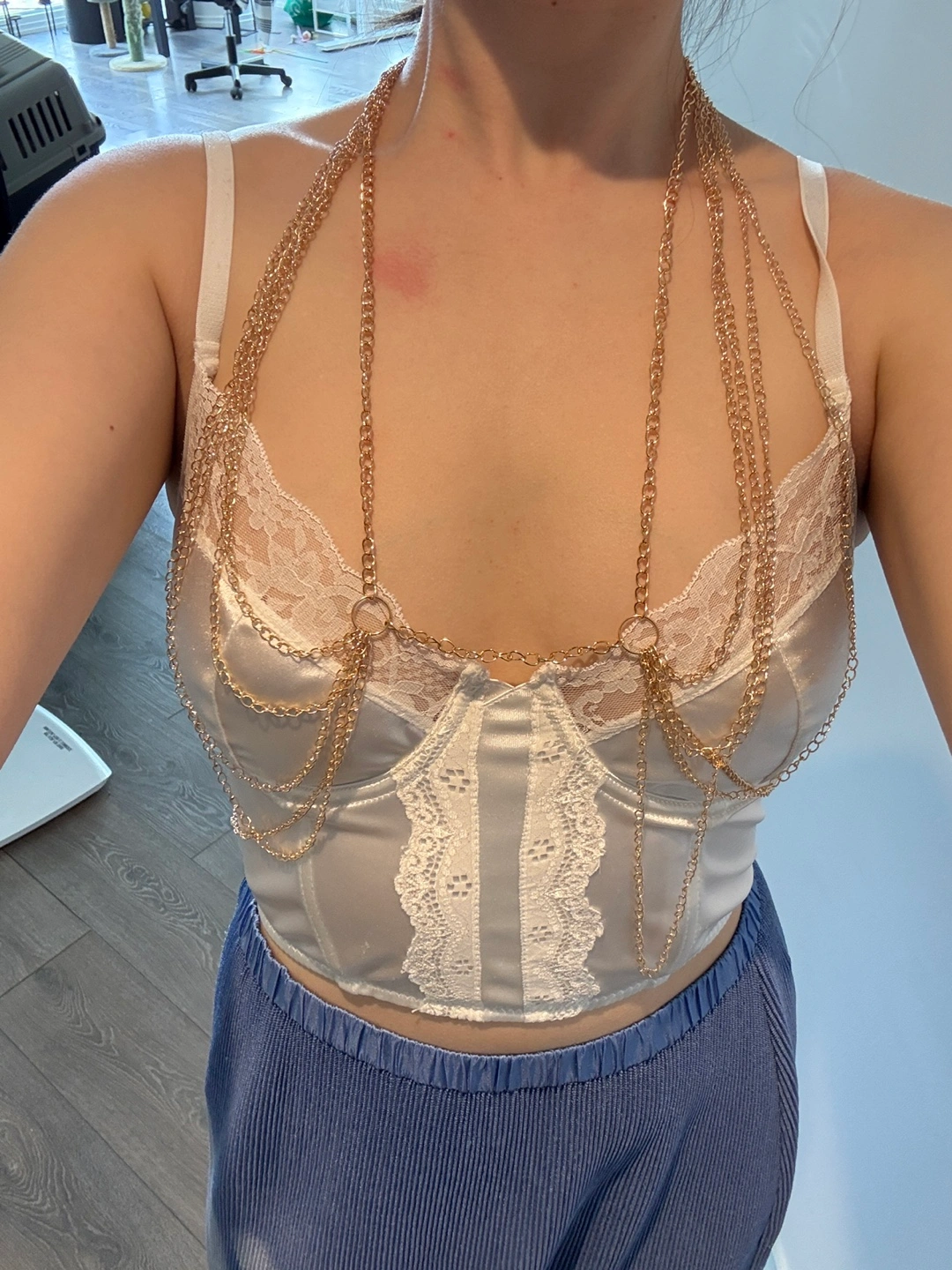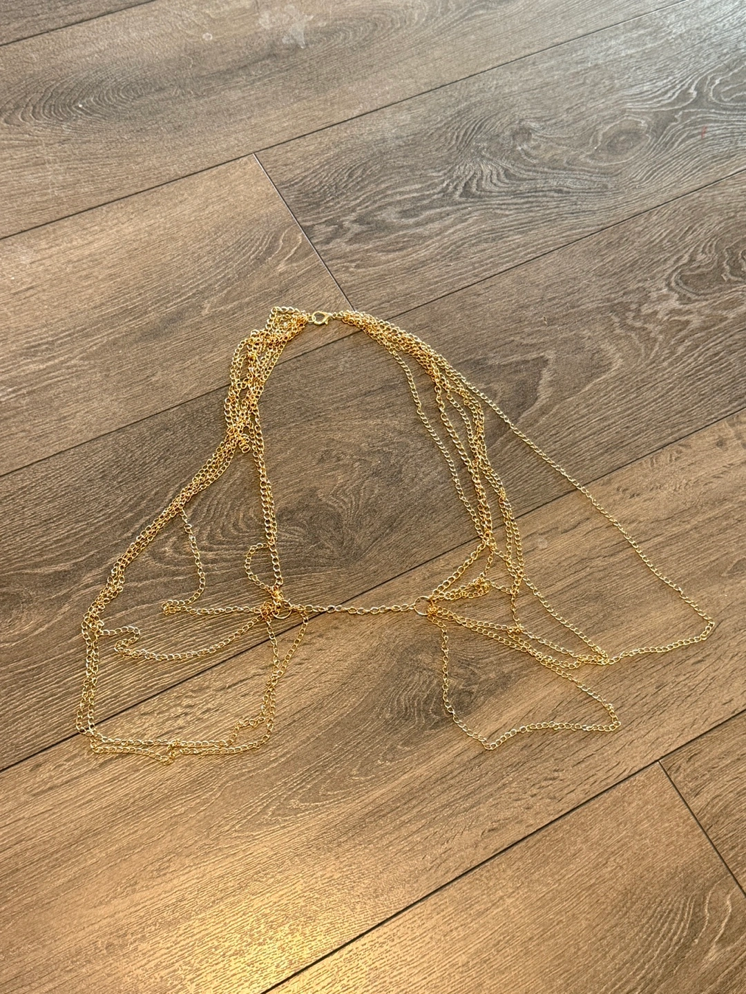 Multi-layered gold chain body harness. Great for layering or wearing alone. Looks great over a top or bralette. Lightweight and comfortable. Brand new