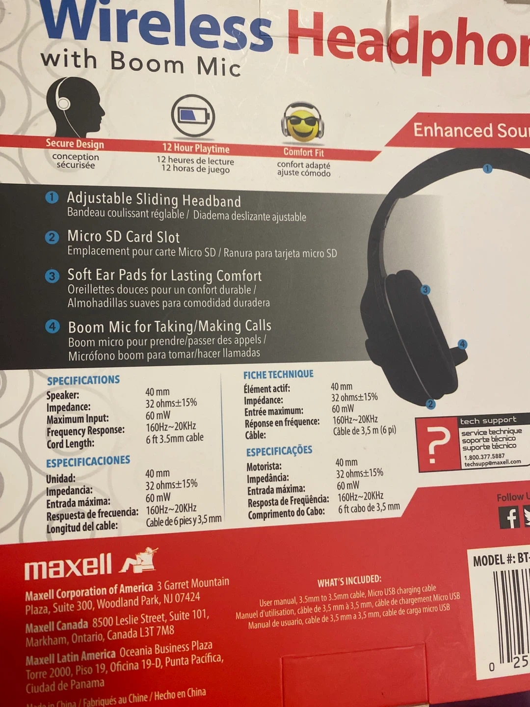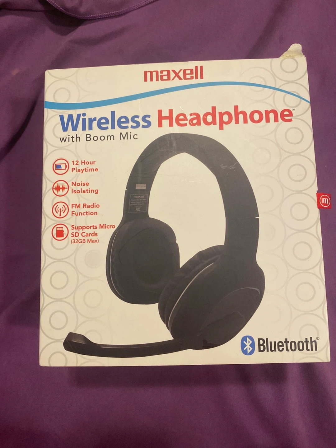 Maxell wireless headphones with a boom mic. Features noise isolating ear pads, 12-hour playtime, and Bluetooth connectivity. Supports Micro SD cards up to 32GB.