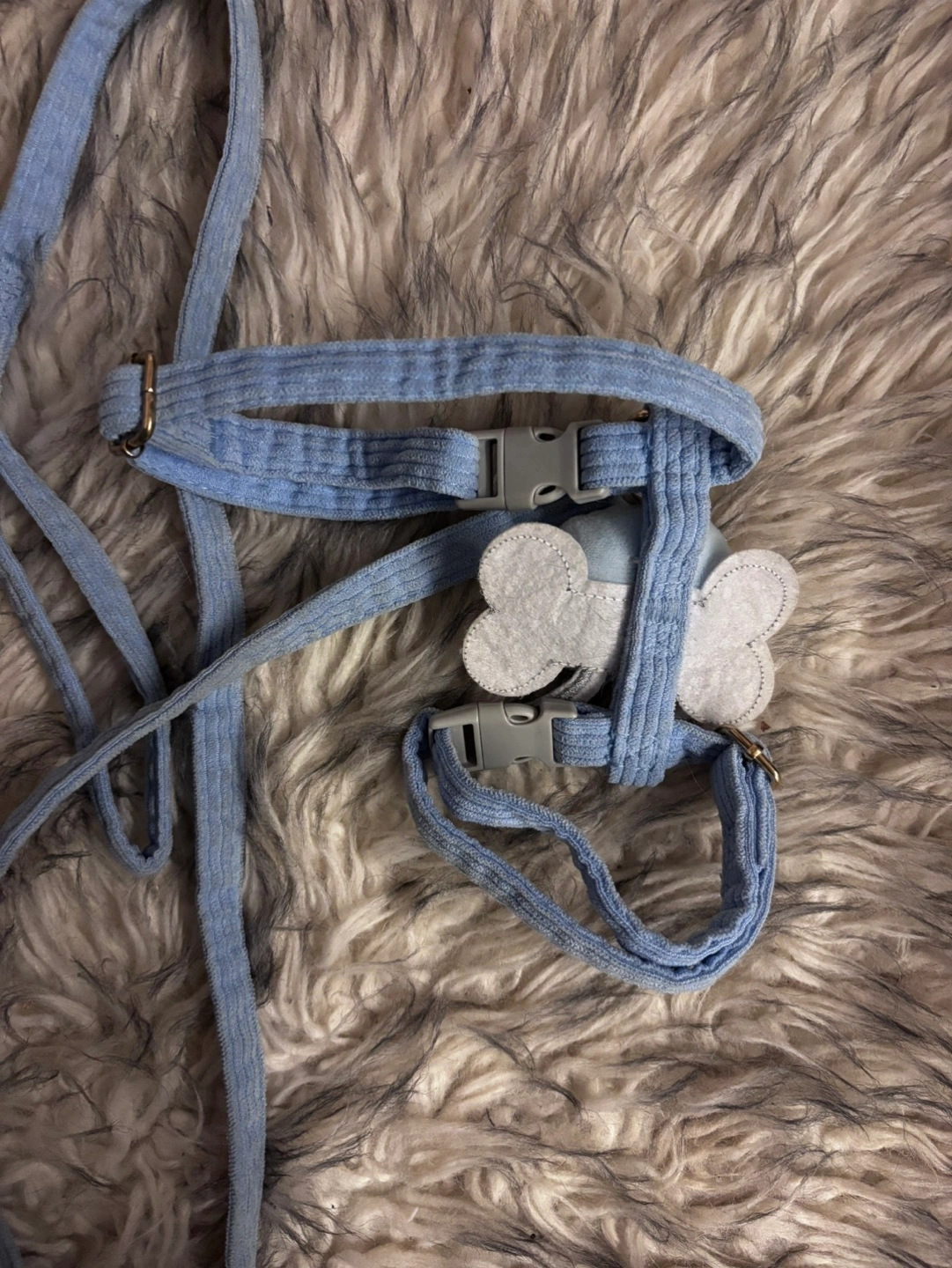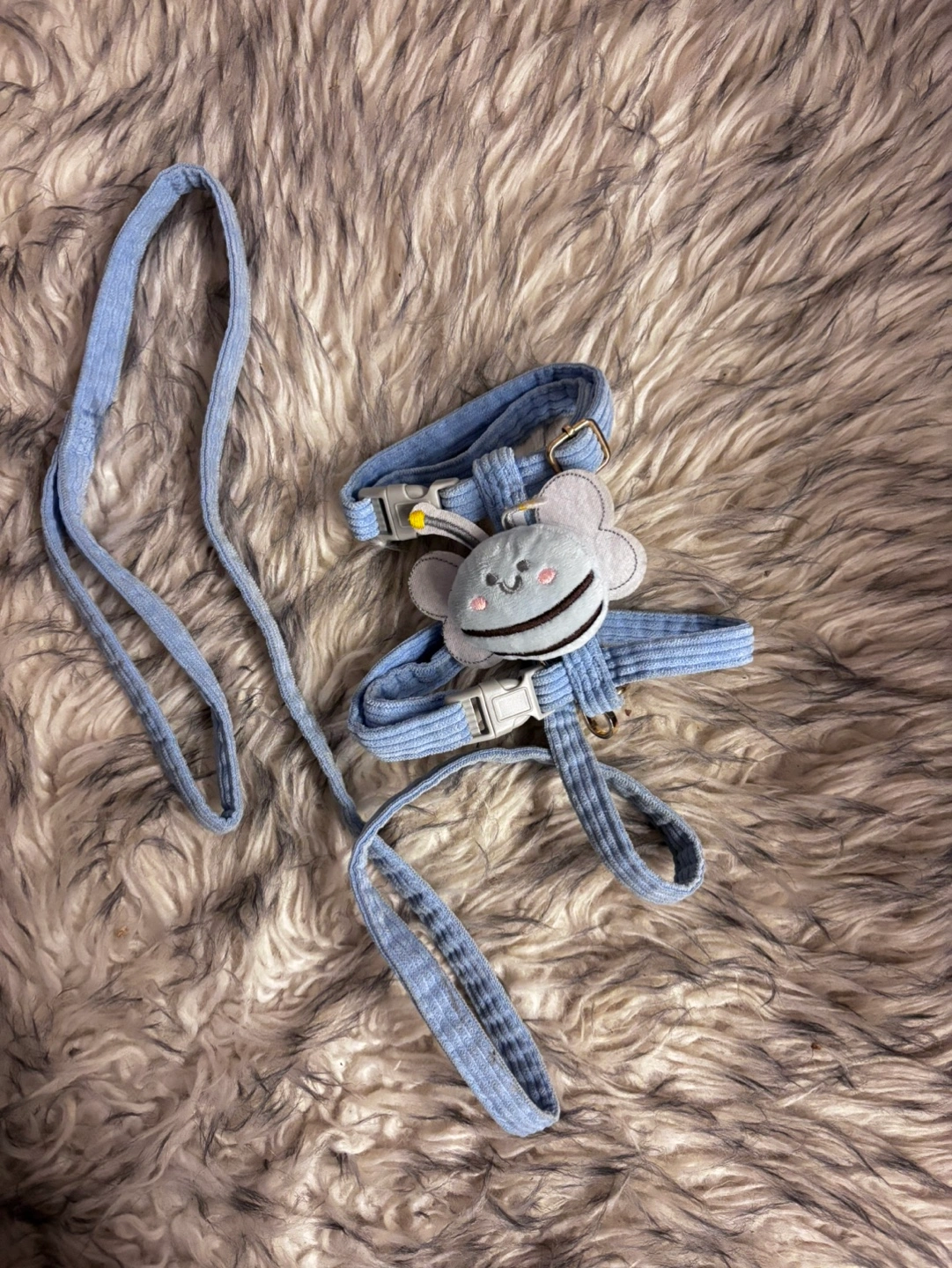 Cute small pet harness and leash set. Light blue corduroy material. Features a charming plush bee design. Adjustable straps. Perfect for small dogs or cats.