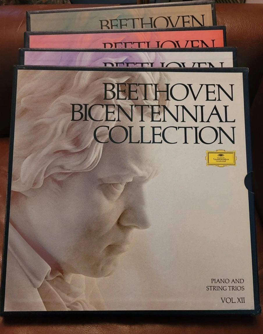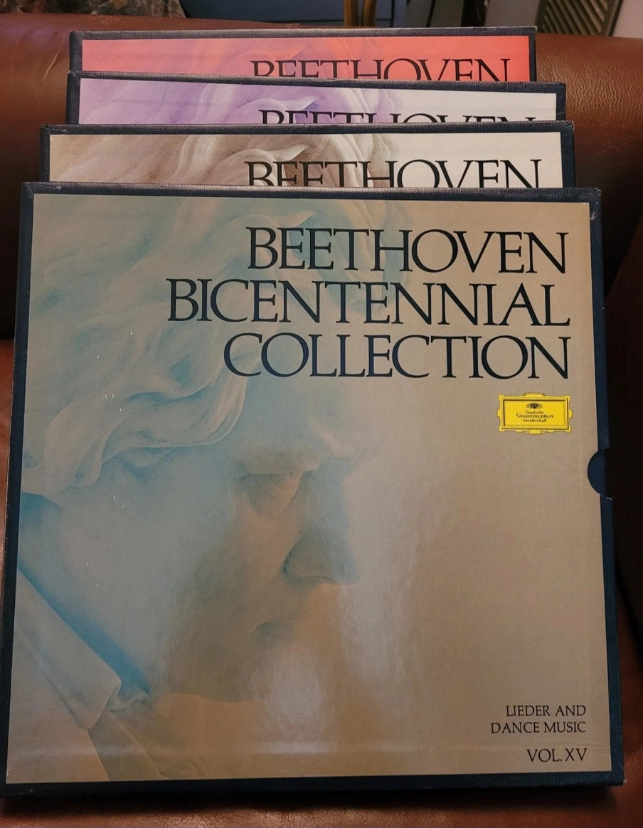 Four vinyl records. Beethoven Bicentennial Collection. Volumes VIII, XII, XIII, and XV. Music for piano, piano and string trios, violin and cello, and Lieder and dance music.