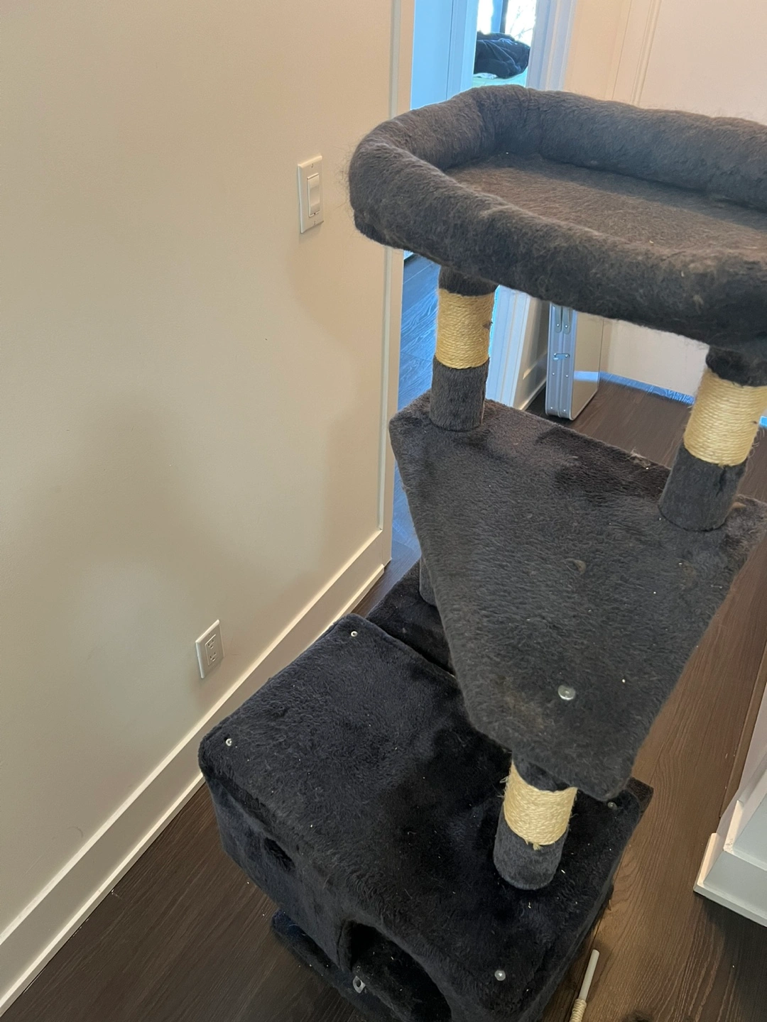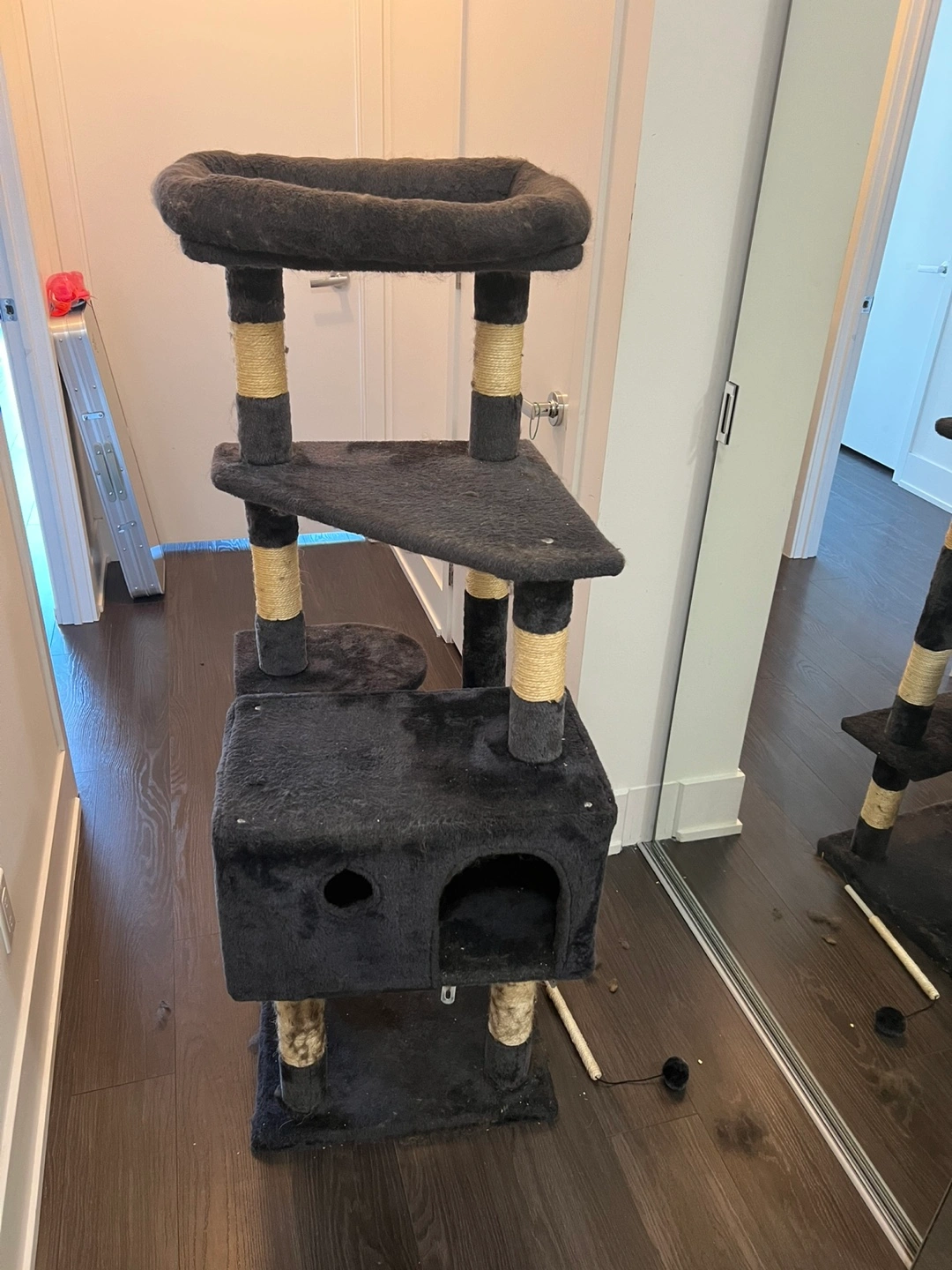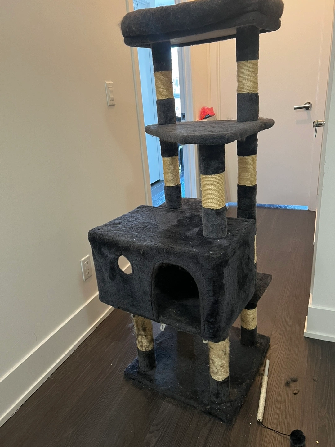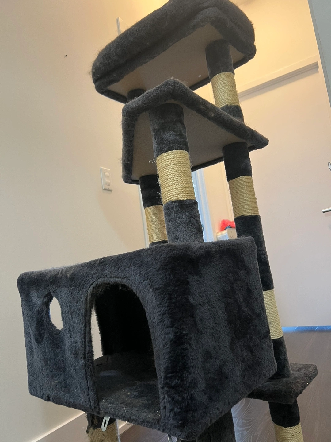 Multi-level cat tree. Dark grey fabric. Sisal scratching posts. Features multiple platforms and a hiding house.