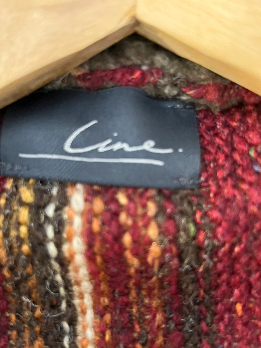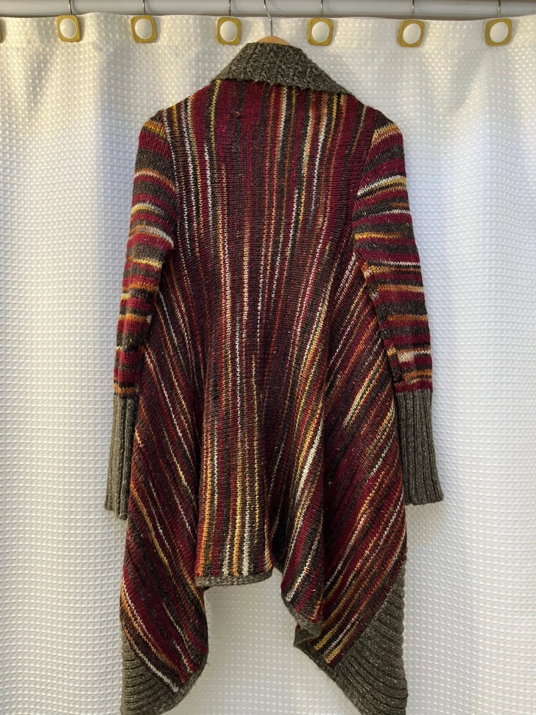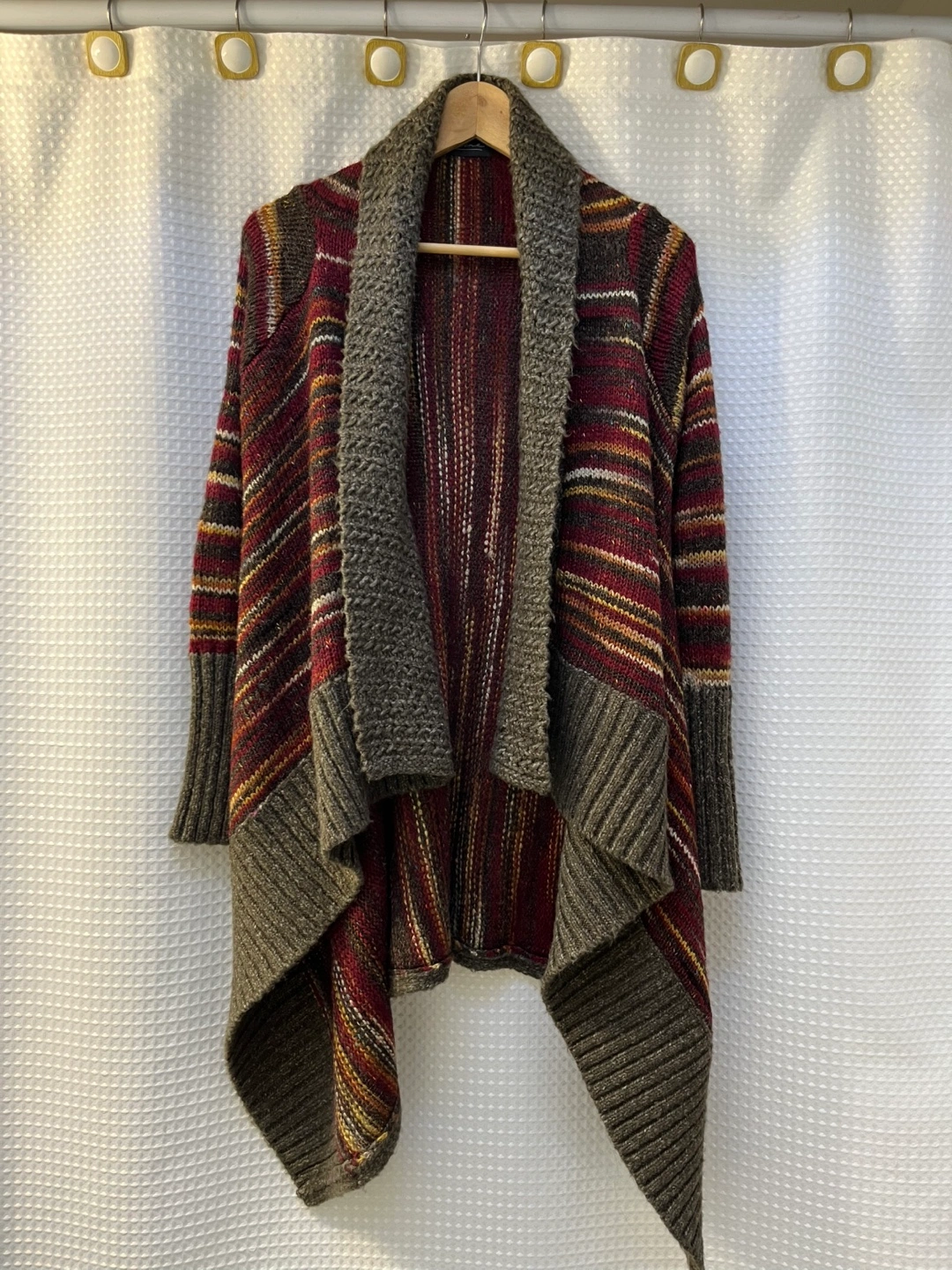Warm and cozy striped cardigan. Features an asymmetrical hem and long sleeves. Soft knit material. Perfect for layering. Never worn.