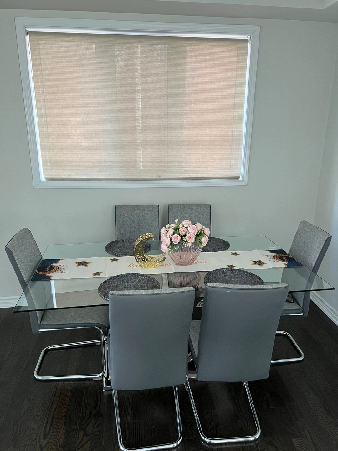 Modern Glass Top Dining Table with 6 Grey Chairs
