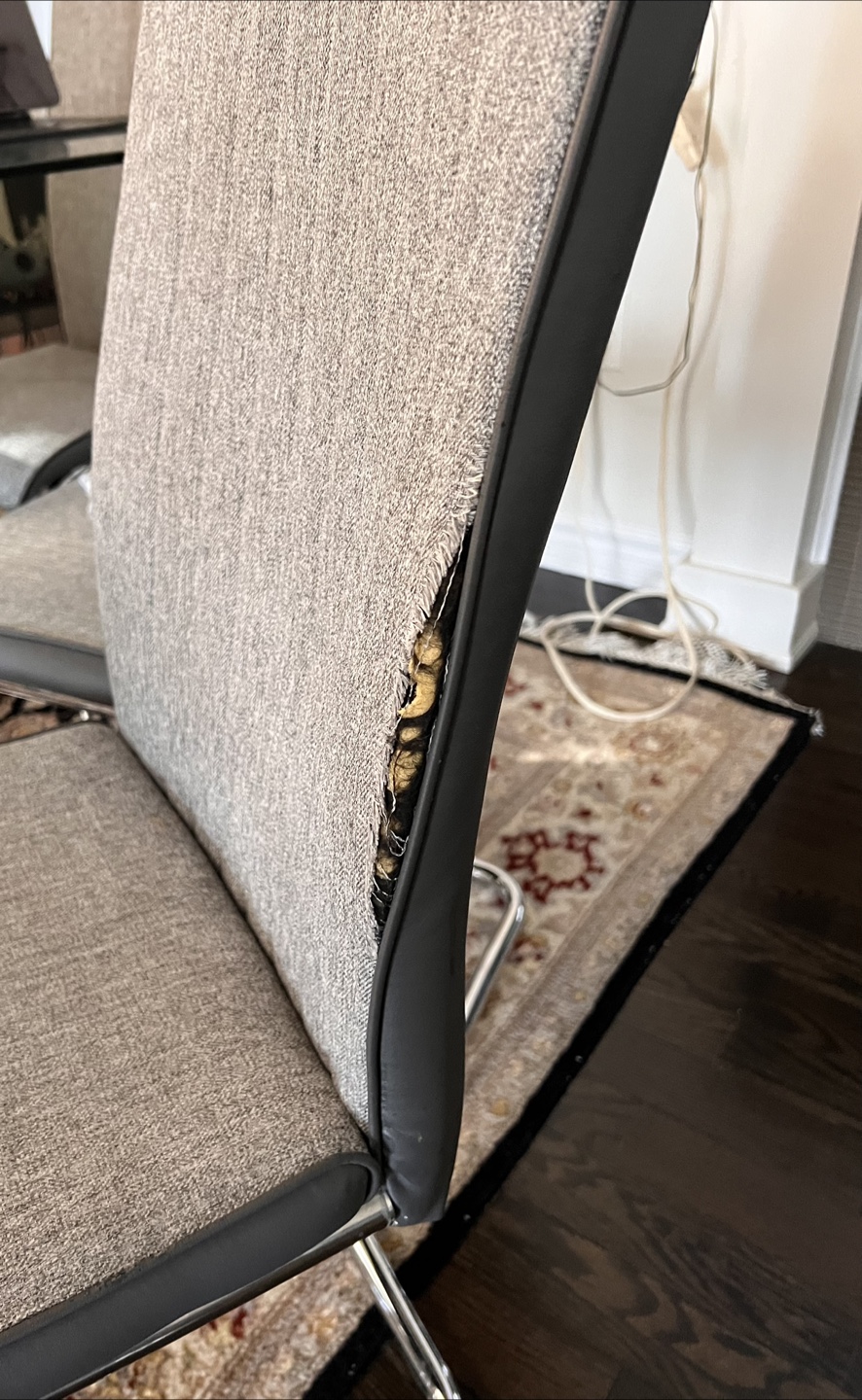 Six-seater dining set. Glass top table, dark wood base, and chrome legs. Grey fabric chairs with metal legs.