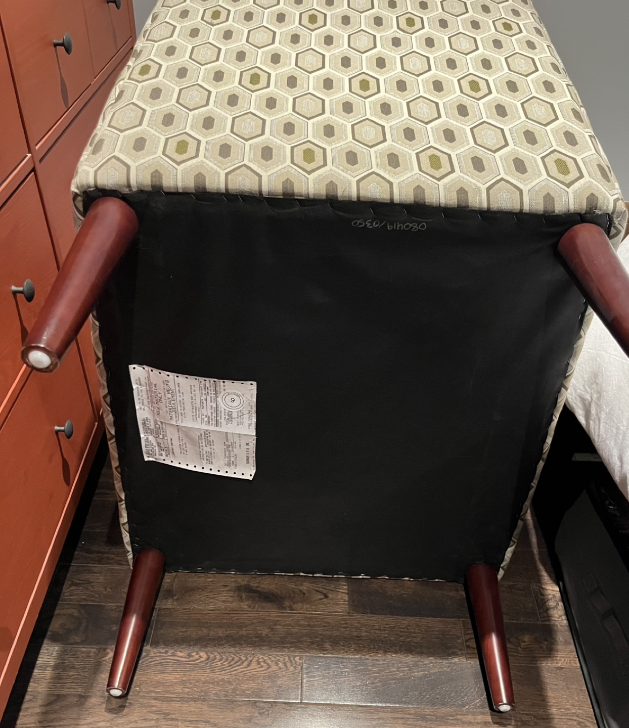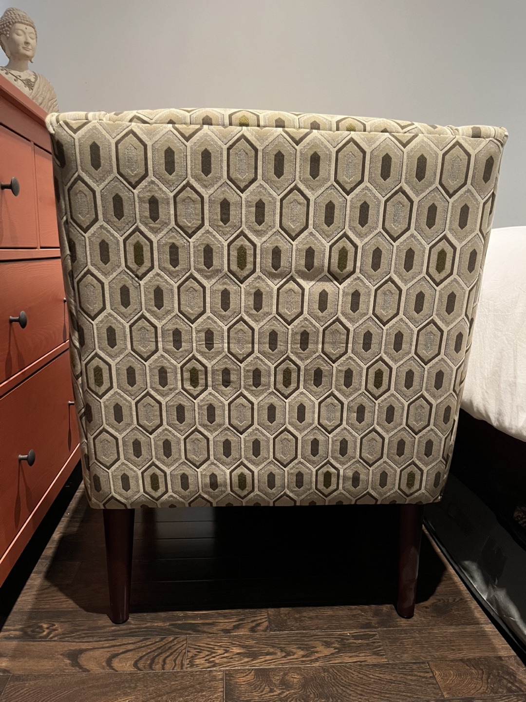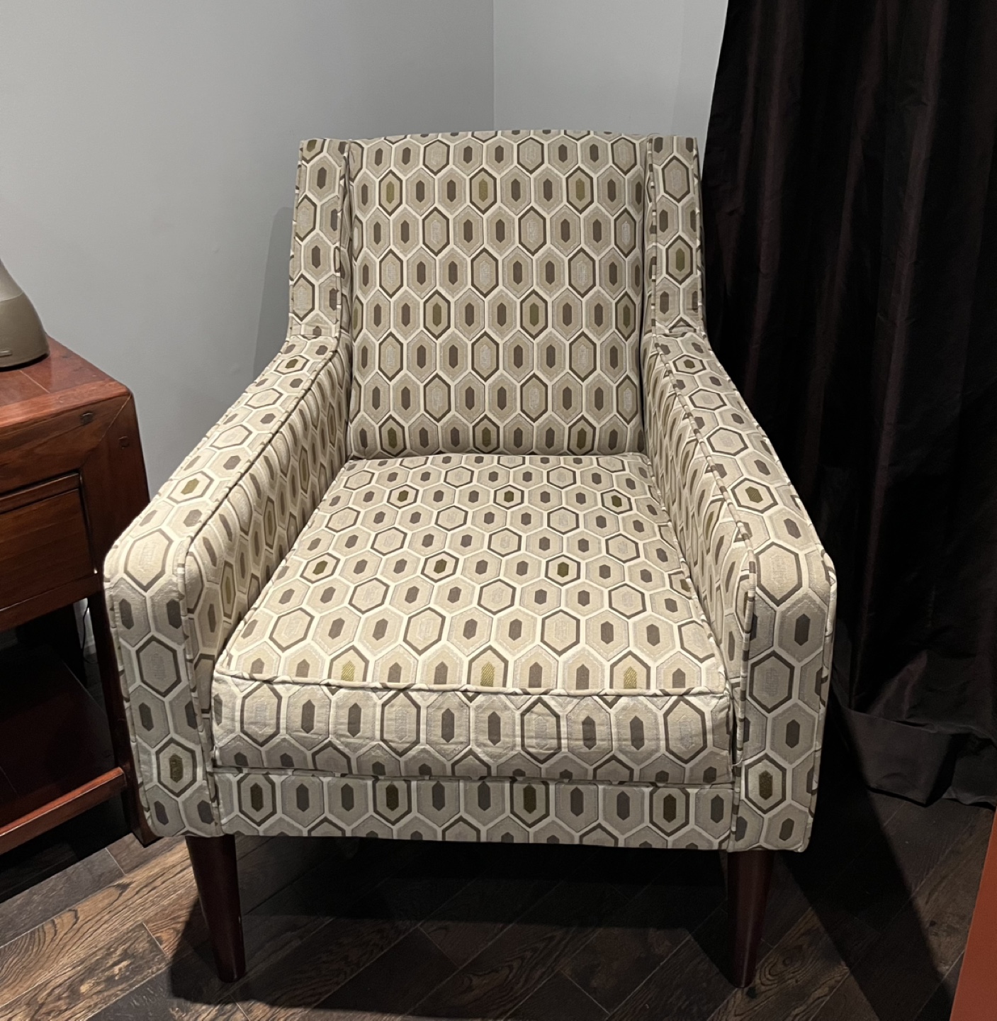 Stylish Bauhaus accent chair, geometric pattern upholstery. Dark brown legs. Comfortable and in great condition. Perfect for living room or bedroom.