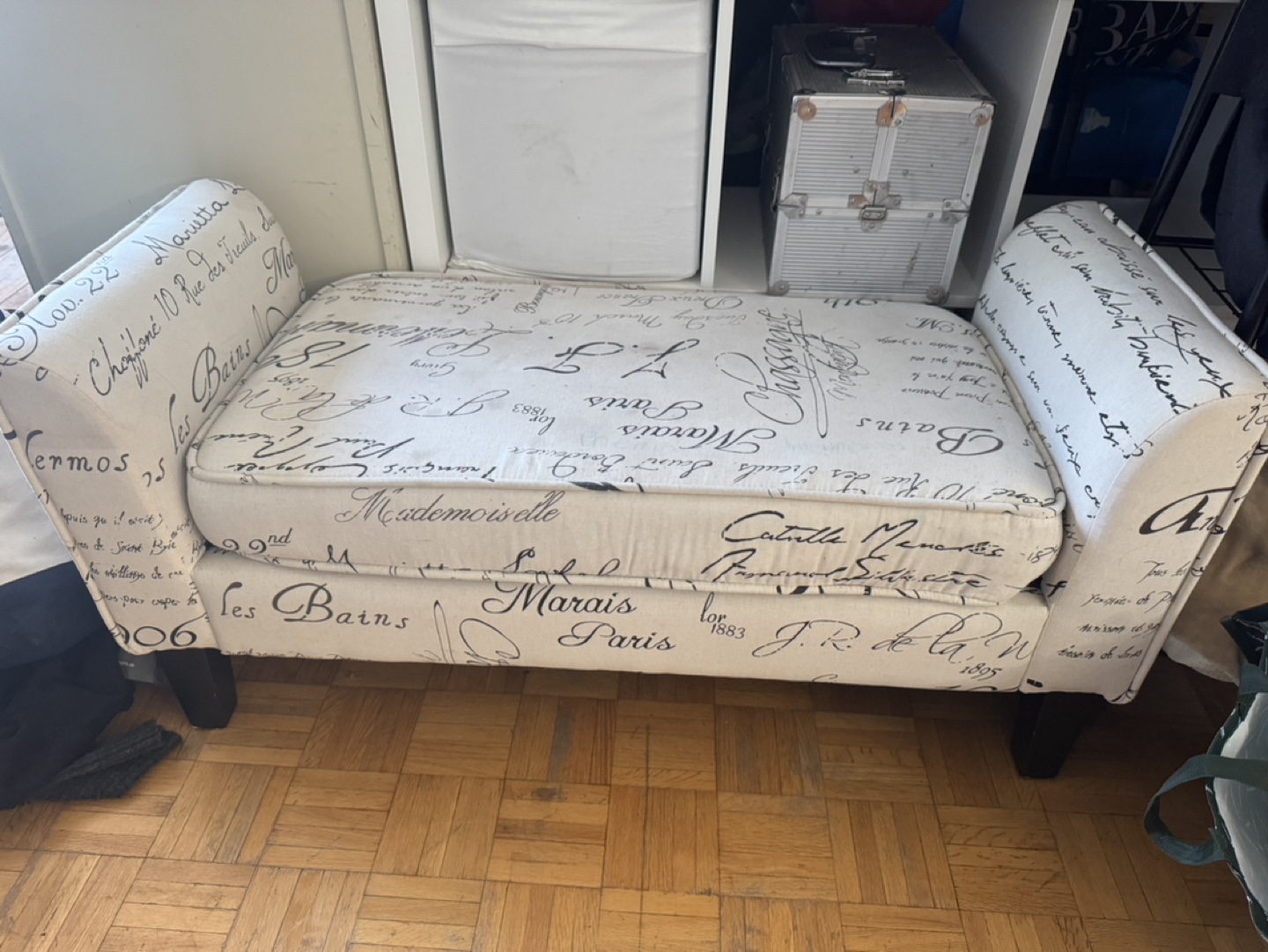 Cute upholstered ottoman. Features a beige fabric with black script print. Dark brown legs. Perfect for extra seating or a stylish footrest.