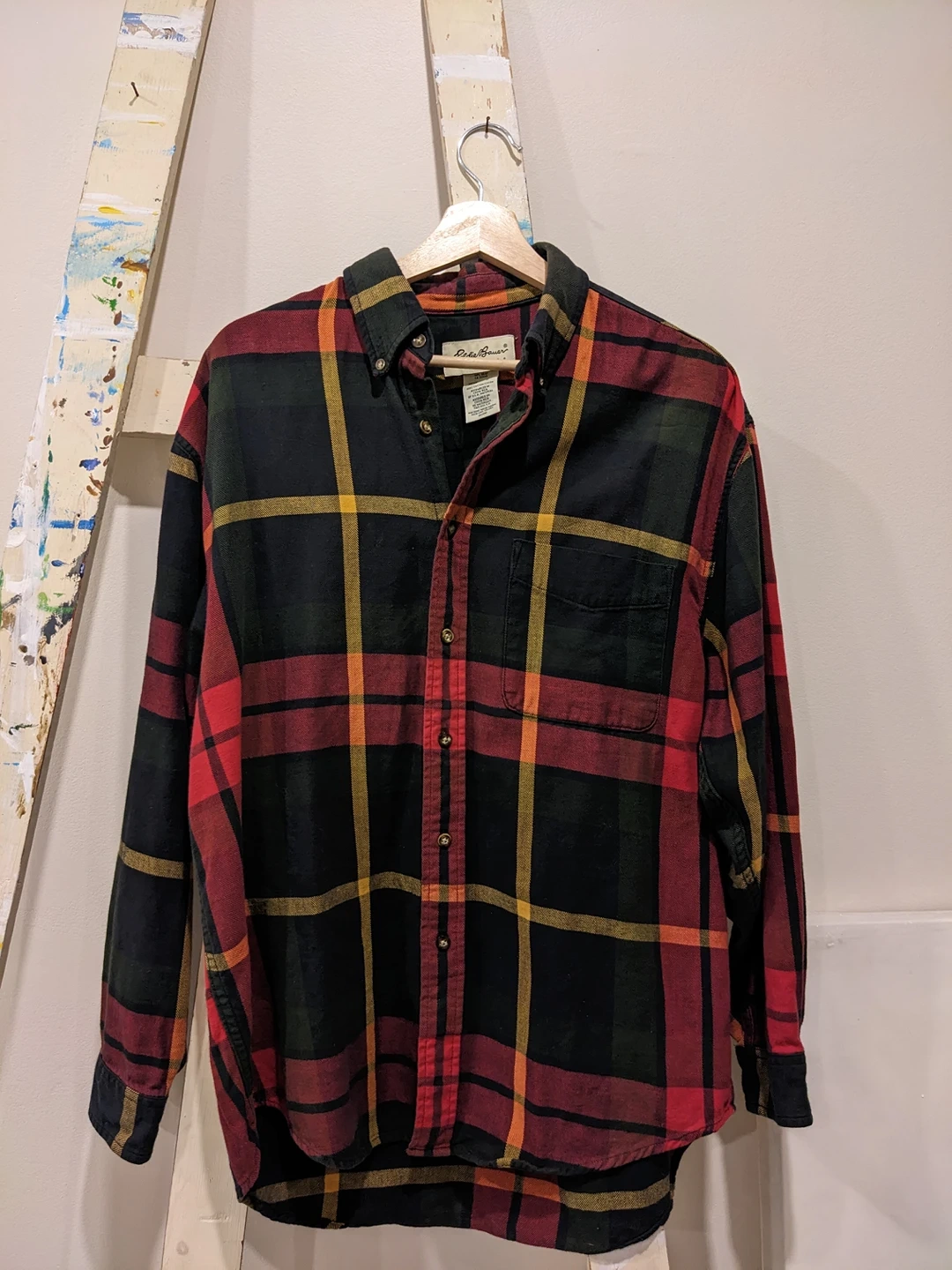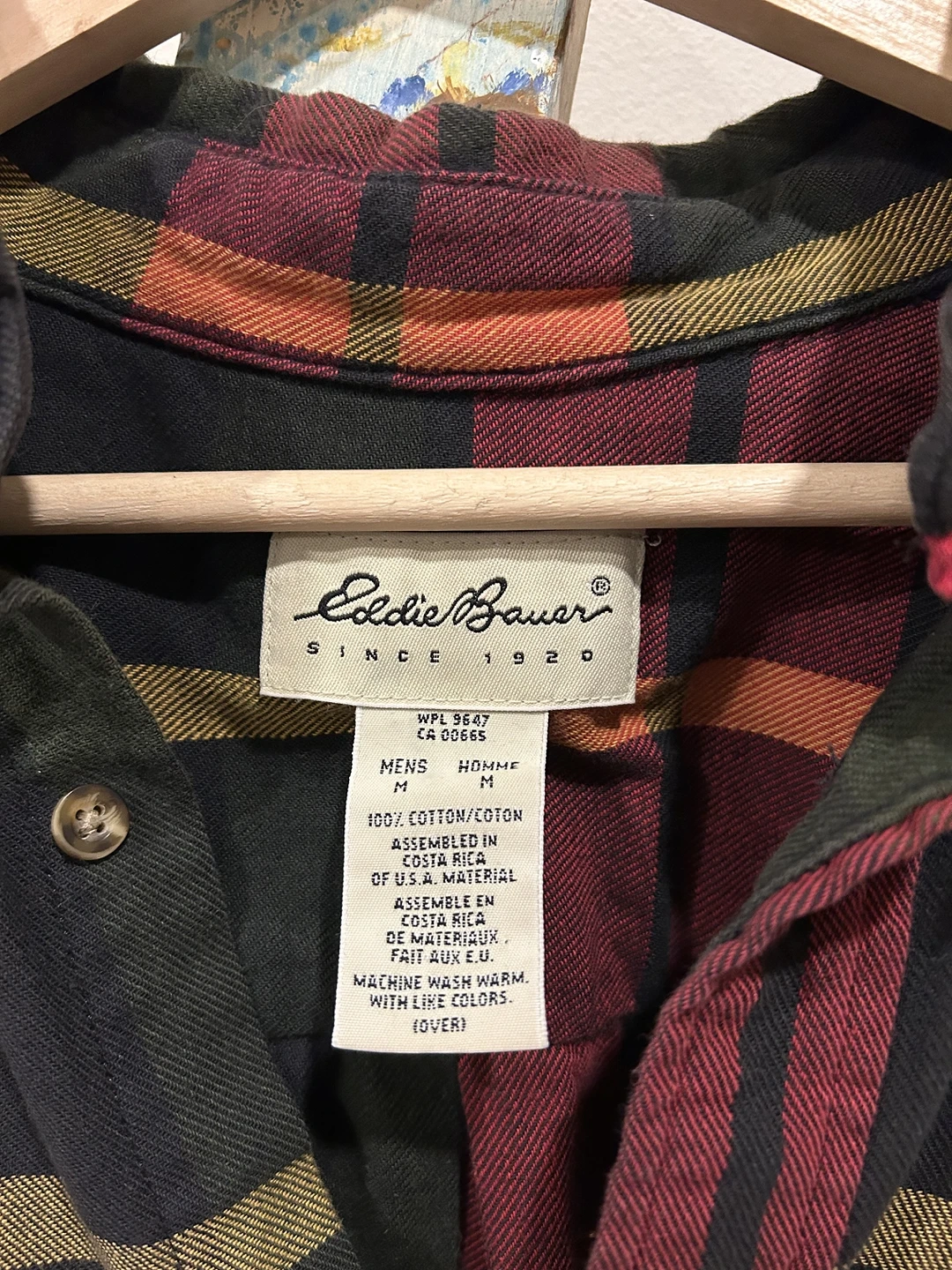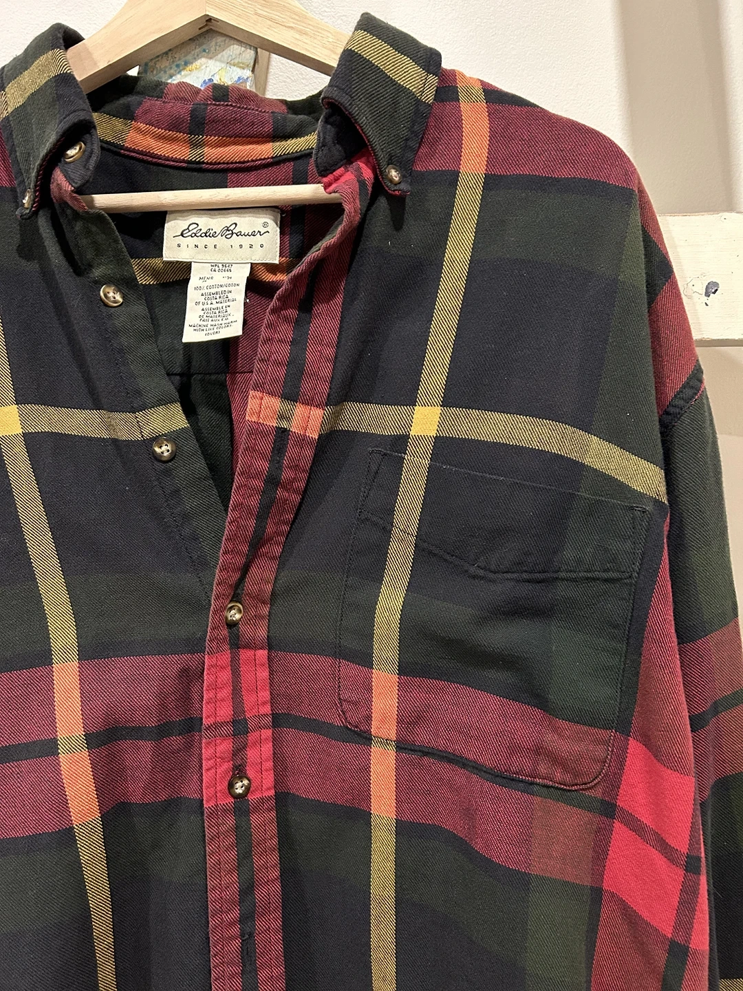 Really cool Eddie Bauer flannel shirt. It's just kinda hard to go wrong with this one, I am particularly fond of it. The material has a nice weight to it, it's just great to throw on top of any t-shirt or to use on its own. Slacker core for sure.