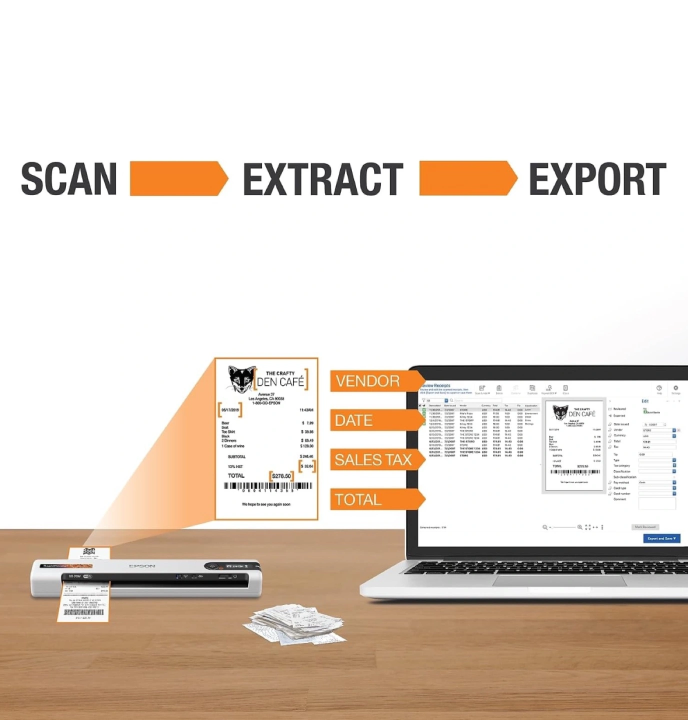 - Scans receipts and other documents.